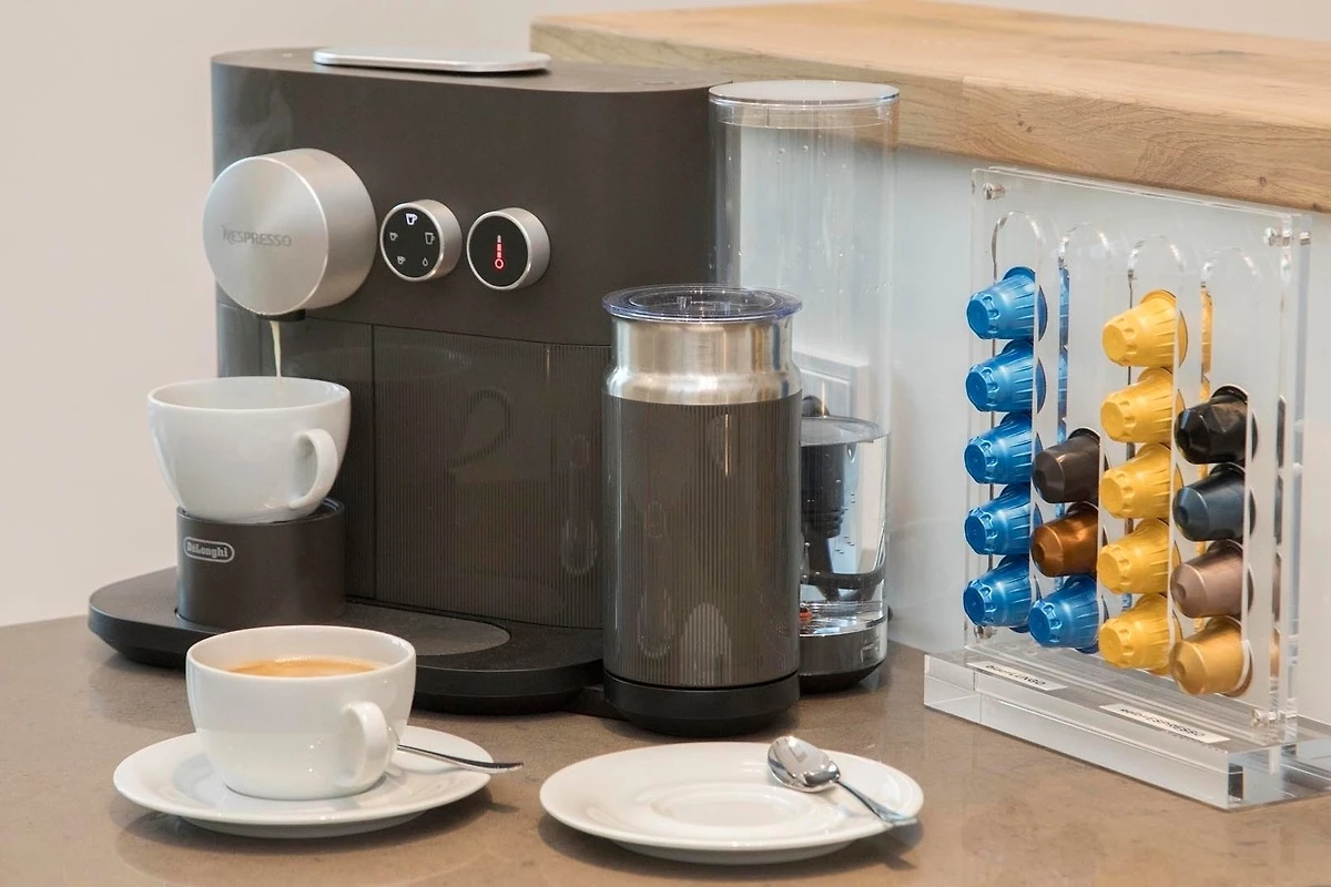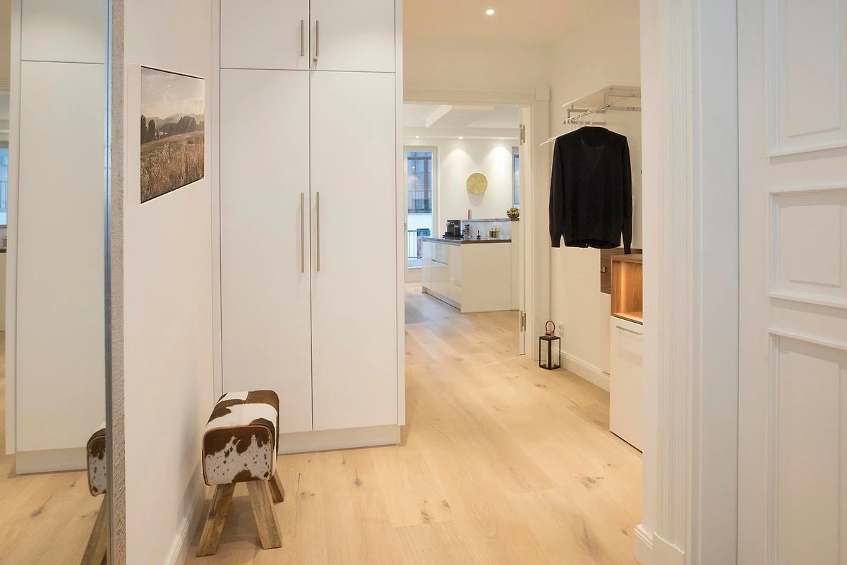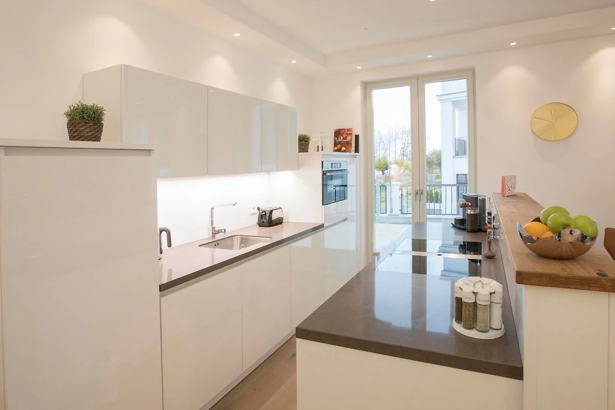 Der Wohnraum ist mit hochwertigen Möbeln von Stressless und BoConcept, Sonos und Tivoli Audio Musiksystemen, 49" Fernseher mit Smart TV und hochwertigen Assesoires ausgestattet. Der angrenzende Ess- und Küchenbereich mit einer vollwertig ausgestatteten Küche, Kochinsel, Tresen, Induktionsherd, Nespresso Expert, sowie allen technischen Geräten, die in eine Küche gehören, wird ihnen Freude beim Kochen und Essen bereiten.
