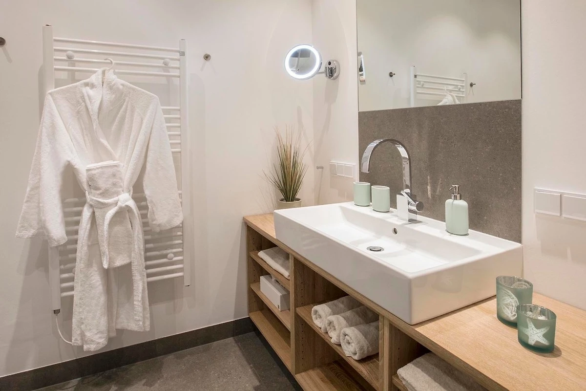 Die 2 Badezimmer en suite, sind jeweils mit ebenerdiger Regendusche, Massivholz-Waschtisch und Fussbodenheizung ausgestattet.