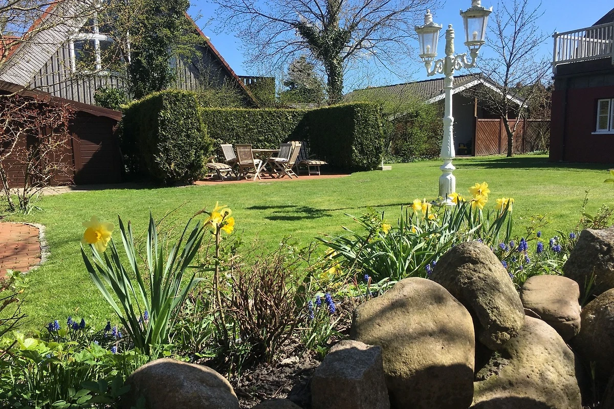 riesiges eingewachsenes Gartengrundstück mit Liegen und Deckchairs auf den Sonnenterrassen, Obstbäumen, Friesenwall und Teich, Parplatz auf dem Grundstück
