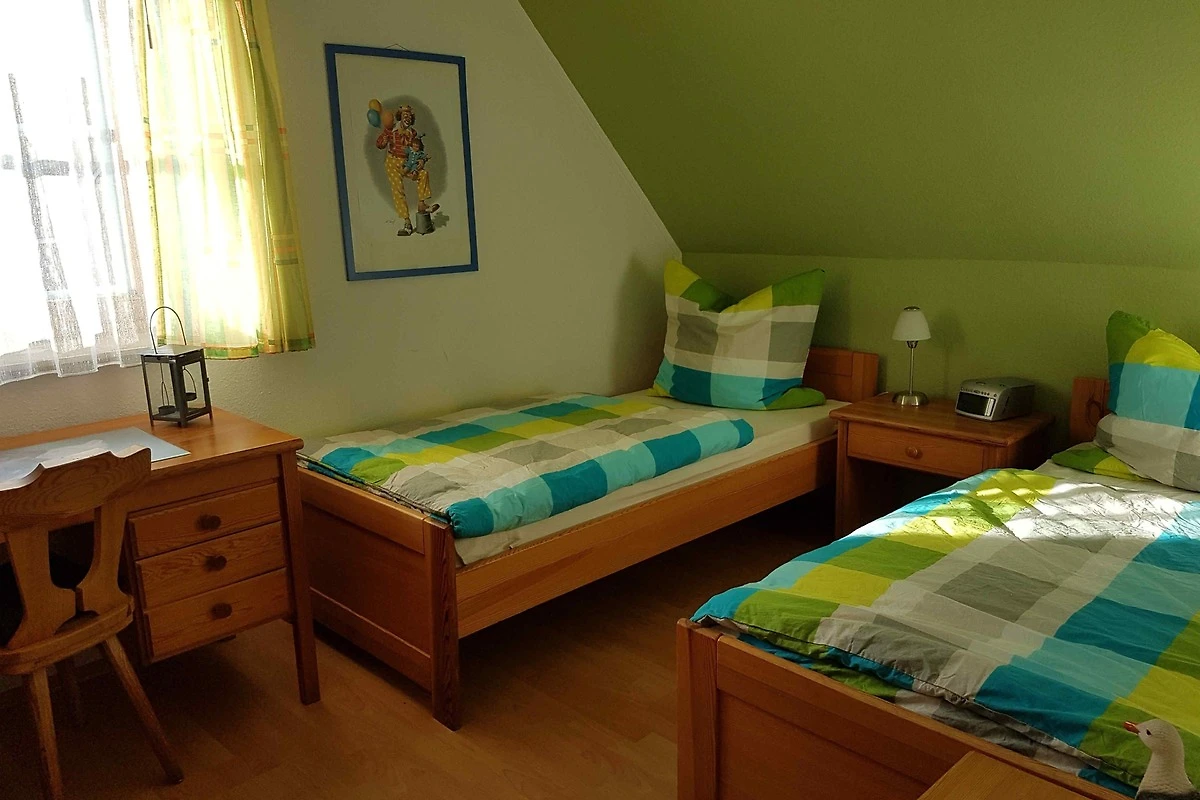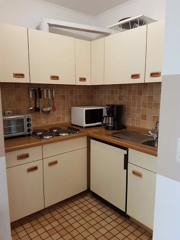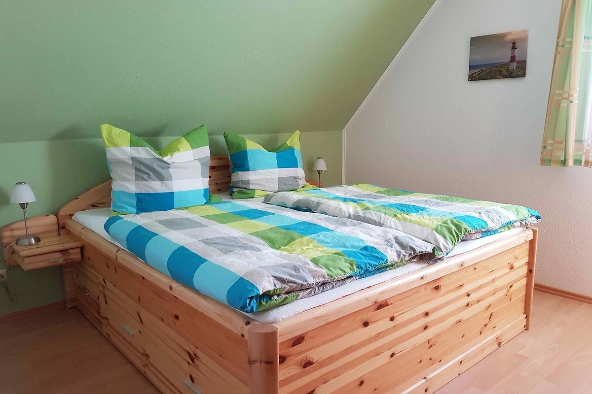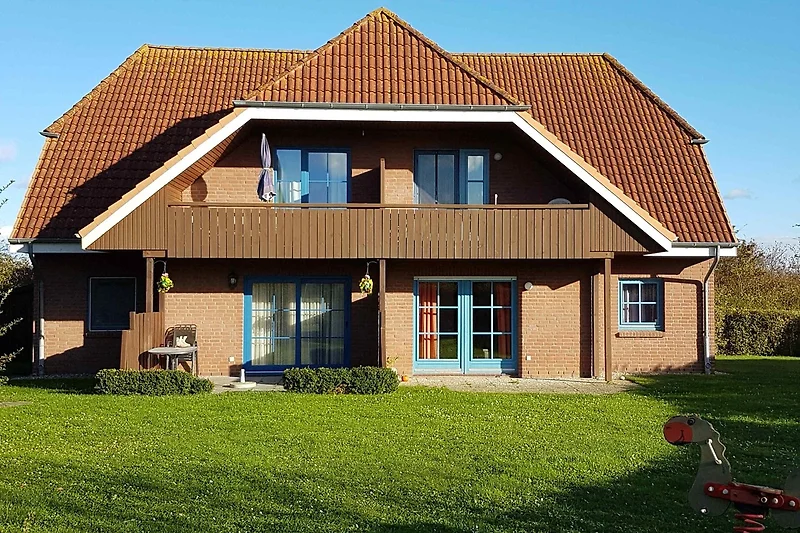 Die Wohnung im Obergeschoss eines Ferien-Doppelhauses ist komplett ausgestattet. Die gemütliche, ca. 63 qm grosse Wohnung besteht aus einer Küchenecke, einem Wohnzimmer mit Essecke, einem Elternschlafzimmer und einem Kinderzimmer mit zwei Einzelbetten. Sie hat ein grosses Duschbad und einen grossen Balkon.