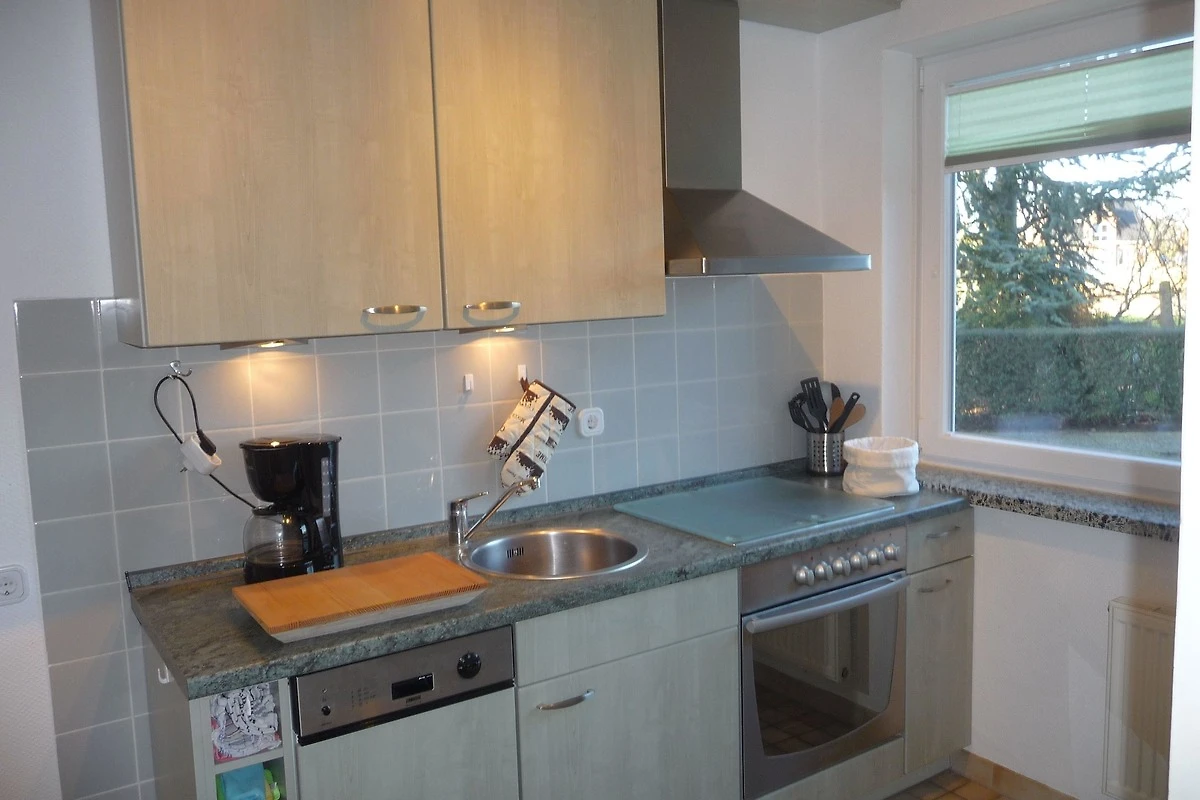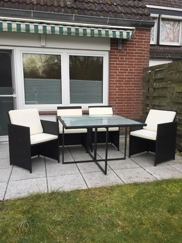 Die geschützte Terrasse mit den eleganten Rattanmöbeln ist nach Westen ausgerichtet und bieten all abendlich eine schöne Sitzgelegenheit im Freien. Zur Wohnung gehört ein Pkw-Stellplatz.