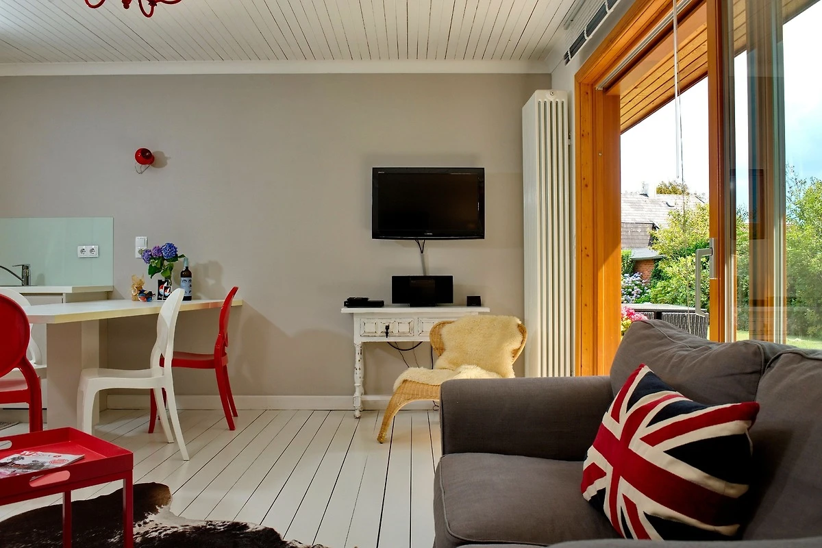 Der Bungalow L hat 2 Schlafzimmer und bietet 4 Personen Platz. Die Räume sind lichtdurchflutet und sehr gemütlich. Im Wohnbereich haben sie eine moderne, offene Küche mit Geschirrspüler, Backofen, Induktionsherdplatte und Mikrowelle. Vom Wohnzimmer aus betritt man durch grosse Schiebetüren die nach Süden ausgerichtete Terrasse und den Garten. Hier können Sie die Sonne geniessen und es sich im Windschatten gemütlich machen. Für Kinder können auf der grossen Spielwiese auf der Rückseite des Bungalows spielen.