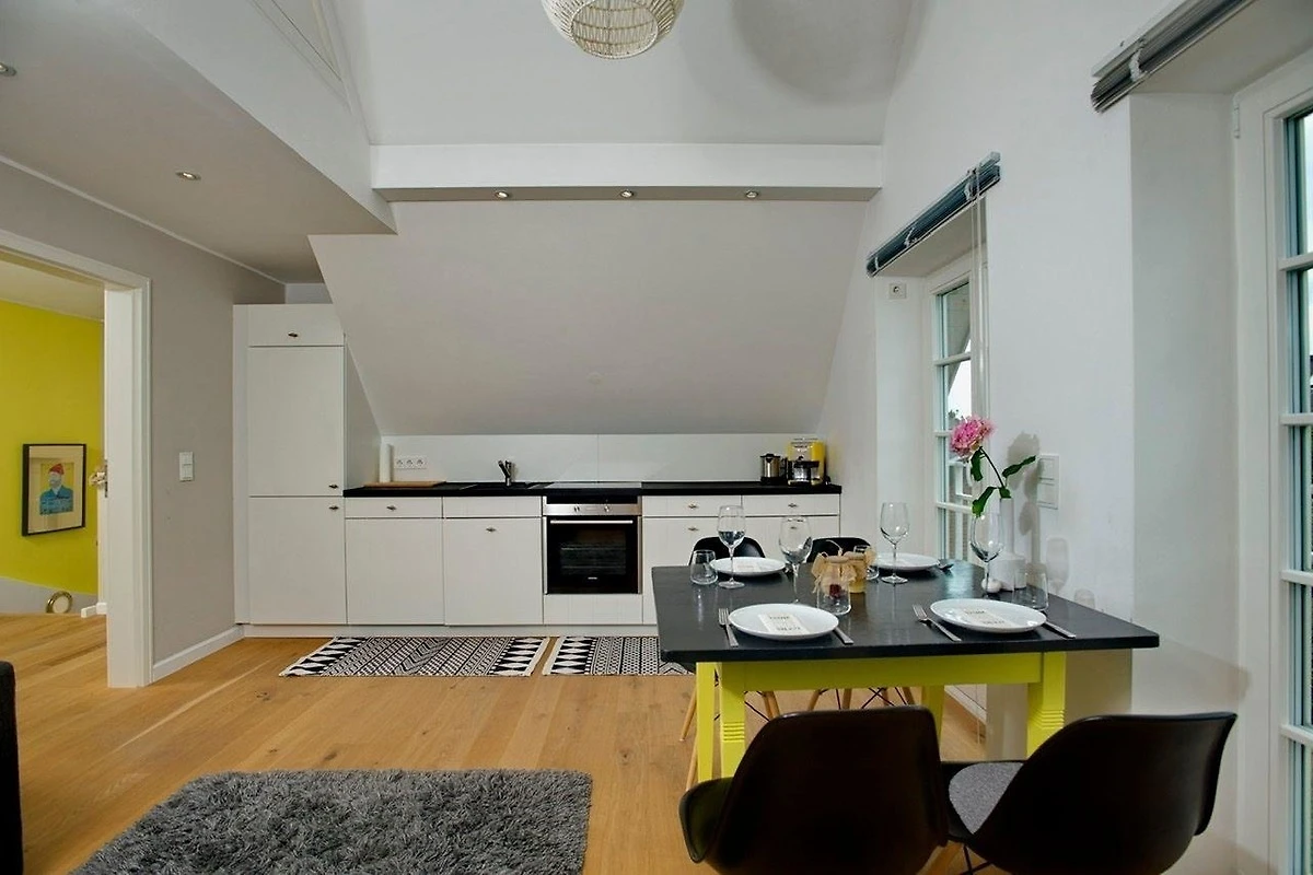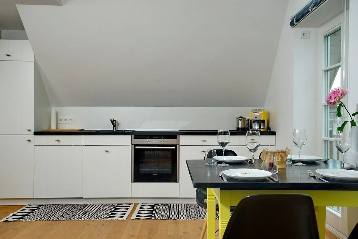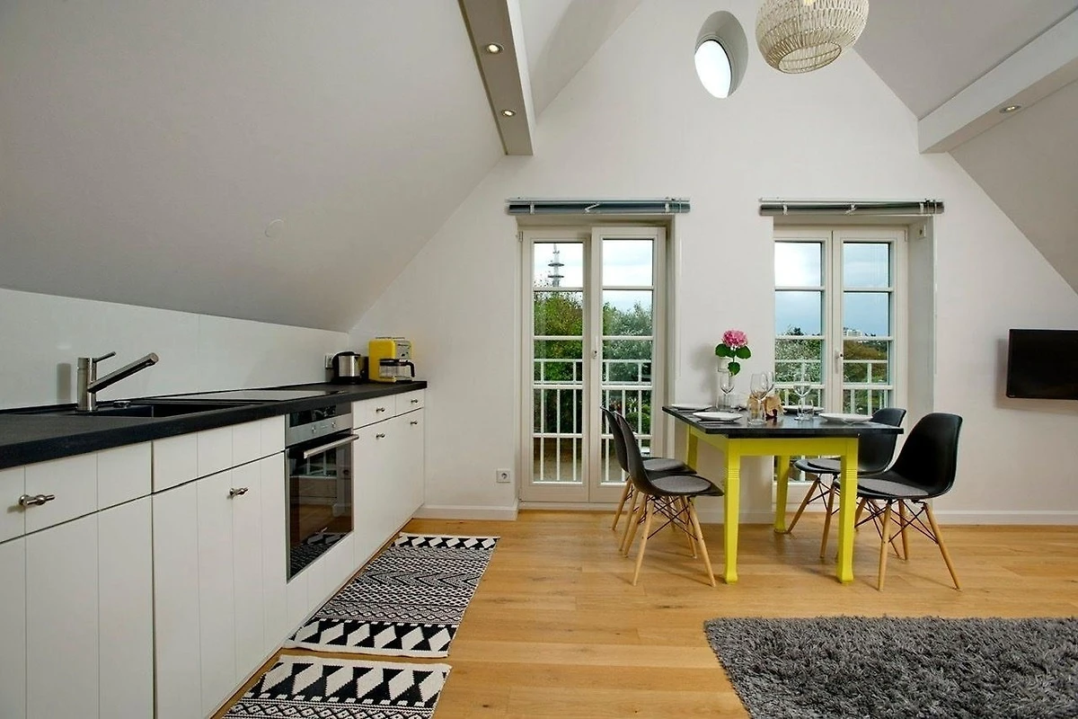 Die grossen französischen Fenster sind Richtung Süden ausgerichtet. Die Wohnung verfügt über Eichendielen, hochwertige Tischlereinbauarbeiten in beiden Schlafzimmern sowie im Wohnzimmer. Im Wohnzimmer befindet sich auch die offene Küche mit Steinarbeitsfläche, Backofen und Cerankochfeld.