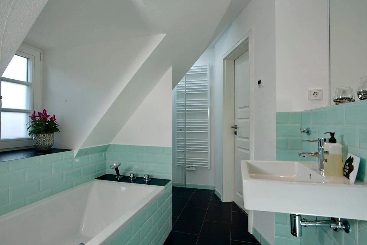 Das Luxusbad verfügt über eine grosse Badewanne und eine extra Raindance Dusche. Sie haben Zugang zum Garten und einen Parkplatz auf dem Grundstück.