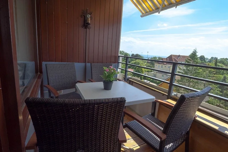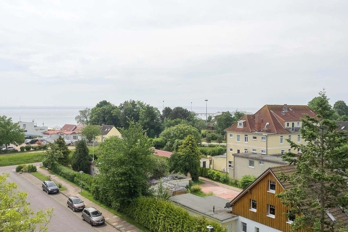 Vom Balkon geniessen Sie einen Blick auf die Ostsee mit der Seebrücke und auf den Ort Kellenhusen