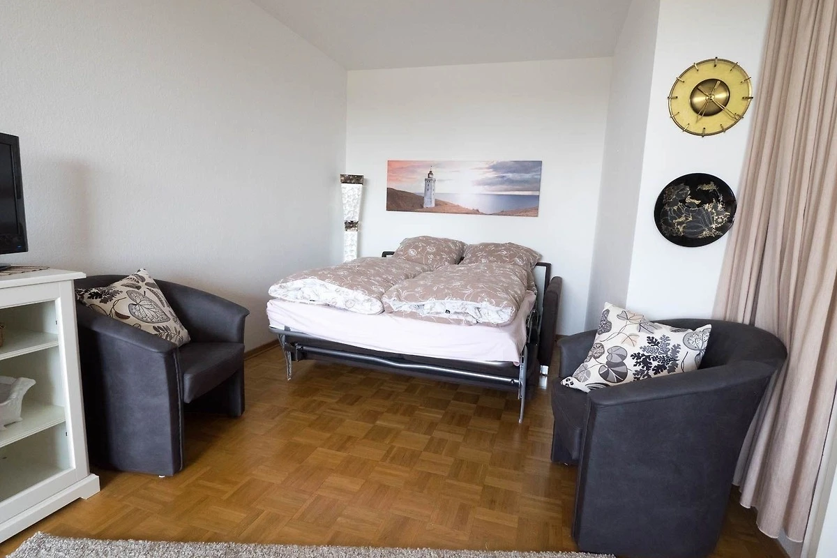 Die Ferienwohnung Leuchtturm Kellenhusen hat ein separates Schlafzimmer mit Doppelbett und eine hochwertige Schlafcouch mit einer Kaltschaummatratze (ca. 1,50m breit) im Wohnzimmer. Vom nach Südwest ausgerichteten Balkon schauen Sie ins Grüne und auch auf die ein paar hundert Meter entfernte Ostsee mit der Seebrücke im Hintergrund. Sie liegt im nördlichen Bereich von Kellenhusen.