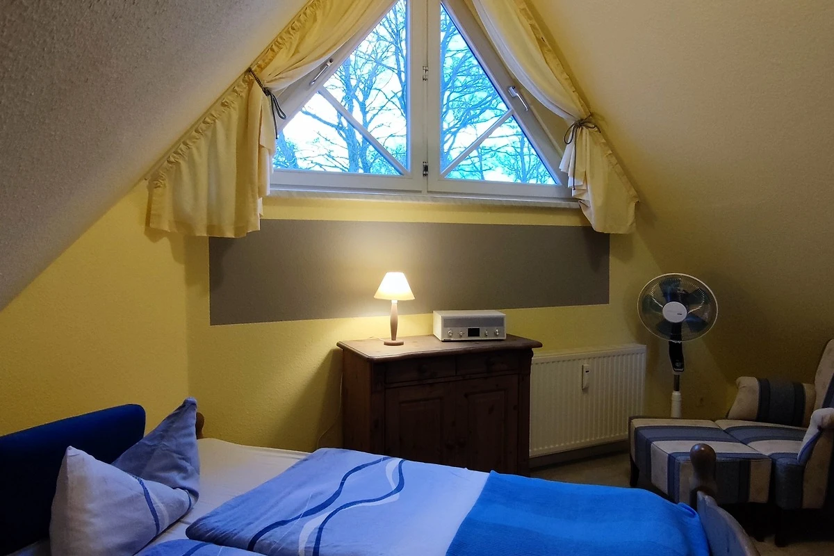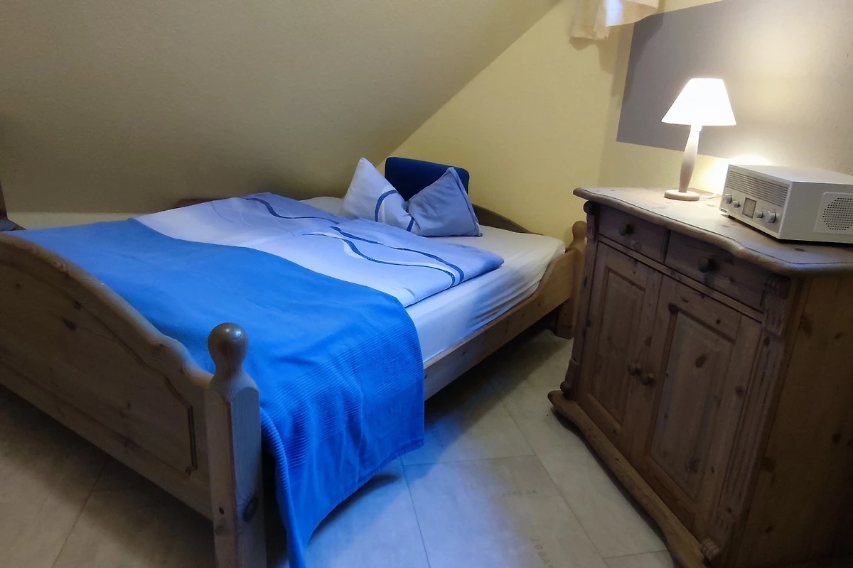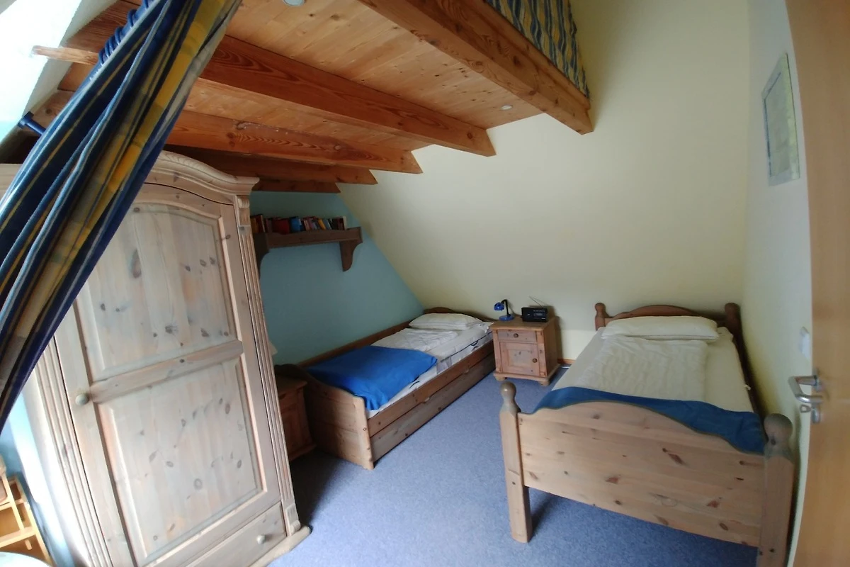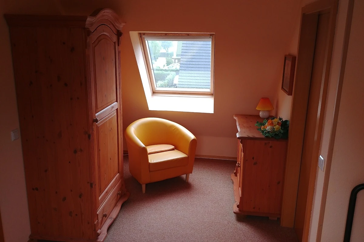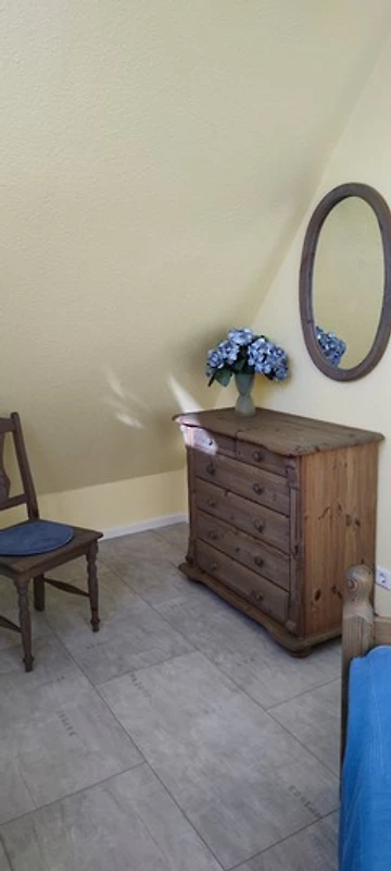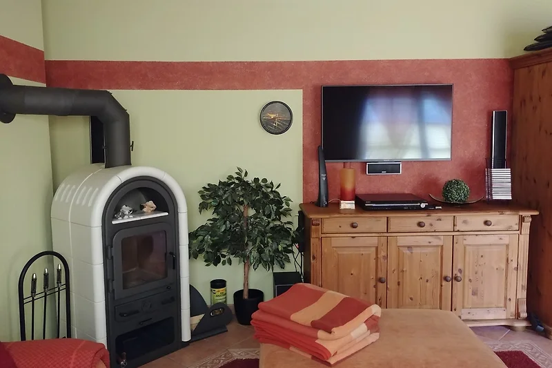 Die 'Abendsonne' ist eine gemütlich und komfortabel eingerichtete Maisonette-Ferienwohnung über 2 Etagen. Ein grosses Wohnzimmer mit kuscheliger Sitzgruppe und Kamin lädt zum Entspannen ein. Die Nachmittags- und Abendsonne auf dem Balkon gab der Wohnung Ihren Namen. Die voll ausgestattete Küche mit langem Esstisch für 6 Personen bietet alles was im Urlaub gebraucht wird. Sogar eine Waschmaschine mit Trockner steht Ihnen zur Verfügung. Das Bad mit Waschtisch, WC und Dusche befindet sich auf der gleichen Etage. Über eine breite Wendeltreppe aus Stahl kommen Sie bequem in das obere Geschoss. Dort gelangen Sie über einen Vorraum in die sich gegenüberliegenden Schlafzimmer. Eines ist mit Doppelbett das andere mit je zwei Einzelbetten und einem Zusatzbett ausgestattet. Die Farben der Wohnung? - Mal ein wenig anders als zu Hause! Gern beantworten wir Ihnen alle Fragen! Rufen Sie uns an! Ihre Familie Mantwill.