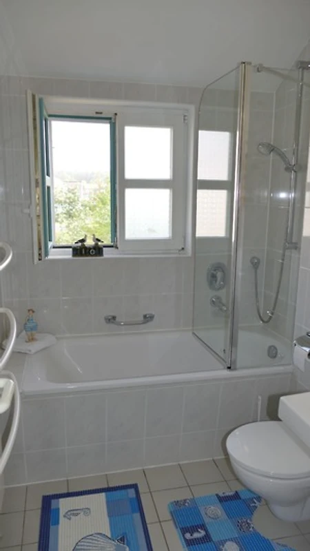 Im Obergeschoss befinden sich ein Schlafzimmer mit Doppelbett, ein zweites Schlafzimmer/Kinderzimmer mit zwei Einzelbetten (zusammenstellbar) sowie ein Vollbad mit Fenster. Für Duschfans befindet sich am Wannenrand eine Duschtrennwand.