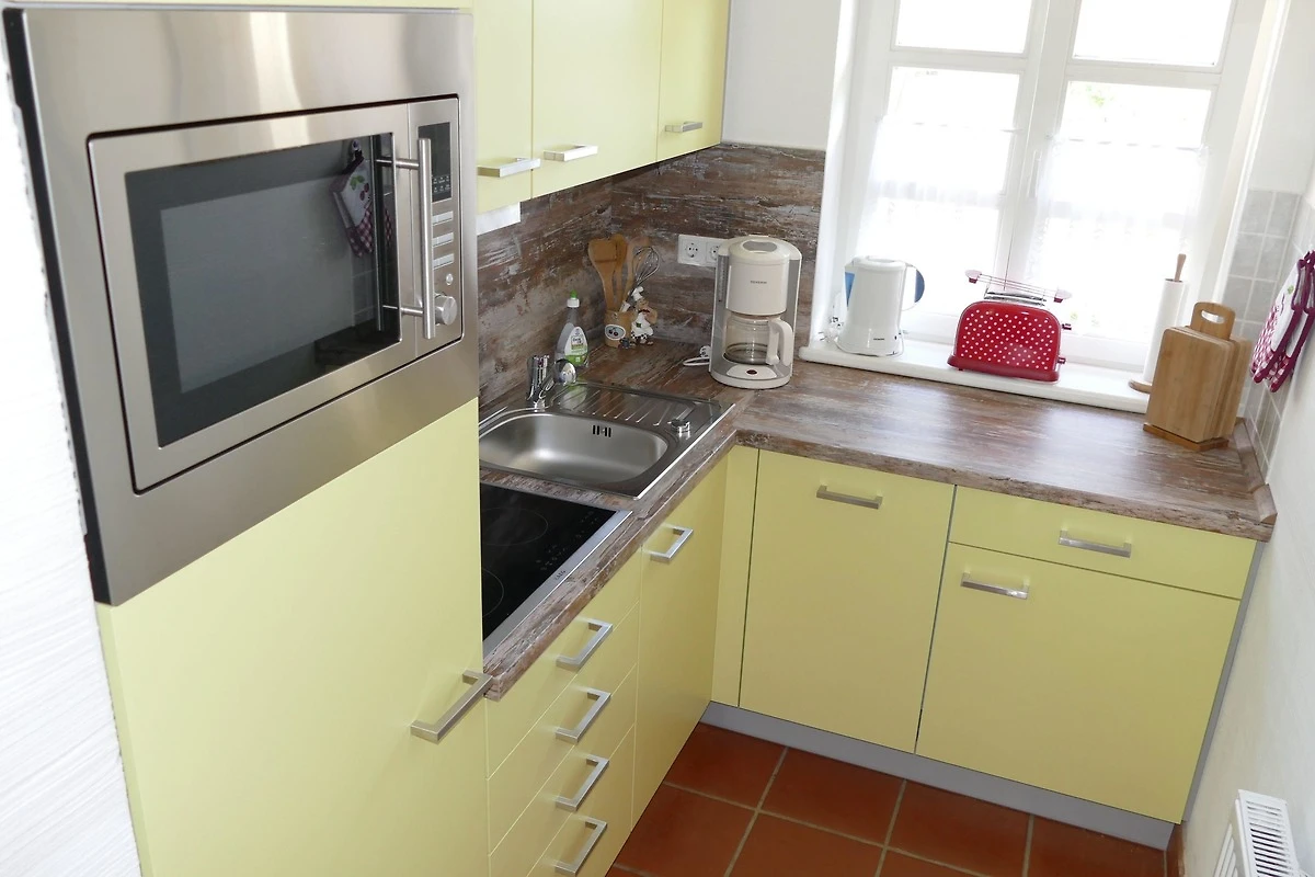 Die stylische Küchenzeile verfügt über Fenster, Cerankochfeld mit Umlufthaube, Geschirrspüler, Kaffeemaschine, Toaster, Wasserkocher, Mikrowelle mit Backfunktion, Kühlschrank mit kleinem Gefrierfach sowie über ausreichend Geschirr zum Essen und Kochen.