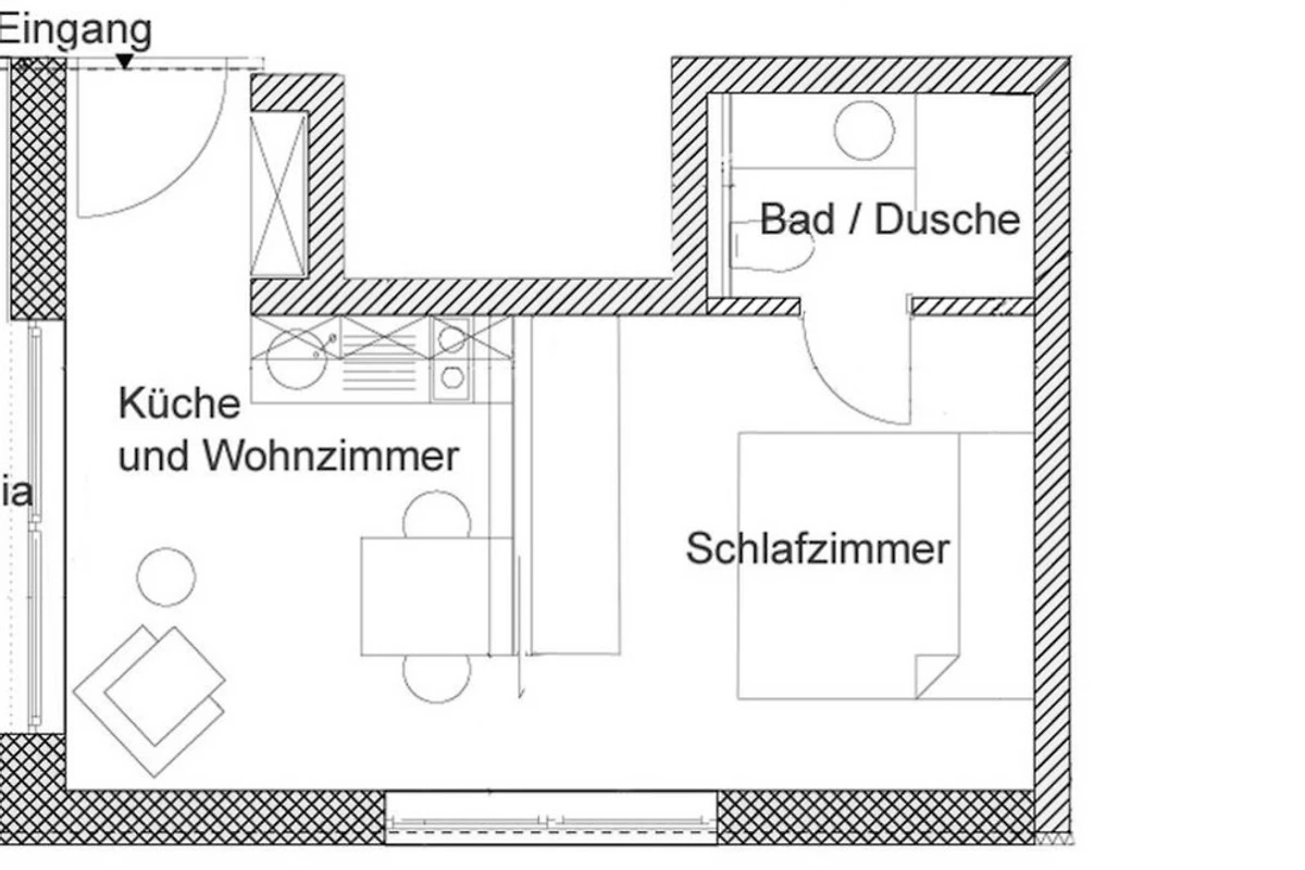 Die modern eingerichtete Ferienwohnung verfügt auf einer Fläche von ca. 30 m² über einen abgetrennten Wohn-/Essbereich, ein Schlafzimmer mit Doppelbett und einen kleinem Freisitz (Sitzbank) im Aussenbereich mit Bergblick.