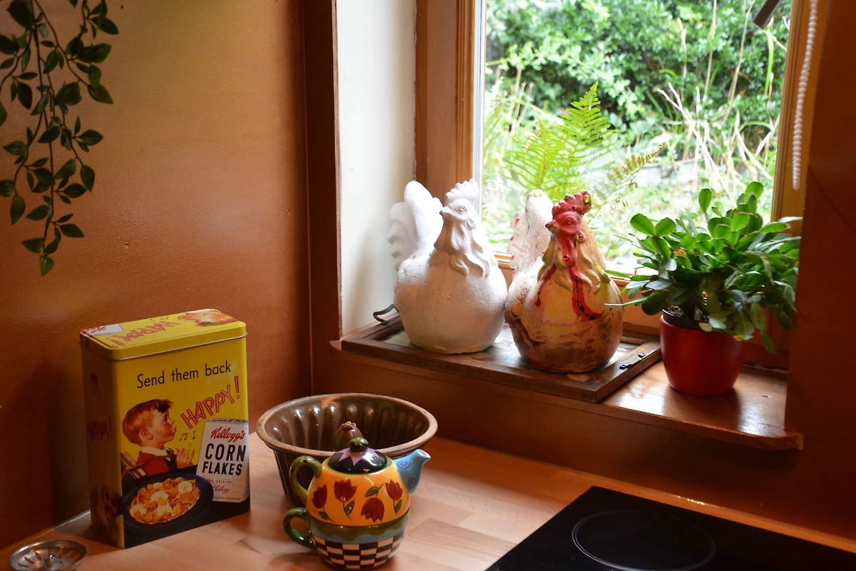 • Kleine Küche mit Herd, Backofen, Kühlschrank, Kaffeemaschine, Toaster