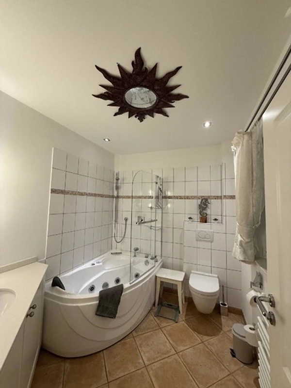 Ausserdem ein Badezimmer mit Whirlpool, Waschtisch, WC, Föhn, Make-up-Spiegel und Waage.