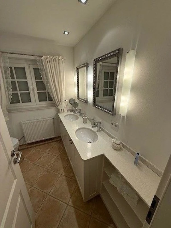 OG: hier befinden sich zwei Schlafräume sowie das zweite Badezimmer mit Dusche, Doppelwaschtisch, WC, Föhn, Make-up-Spiegel und Waage.