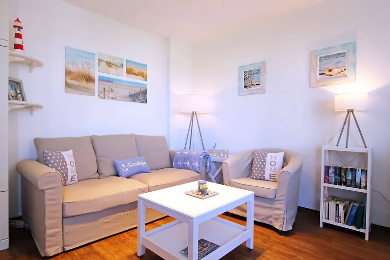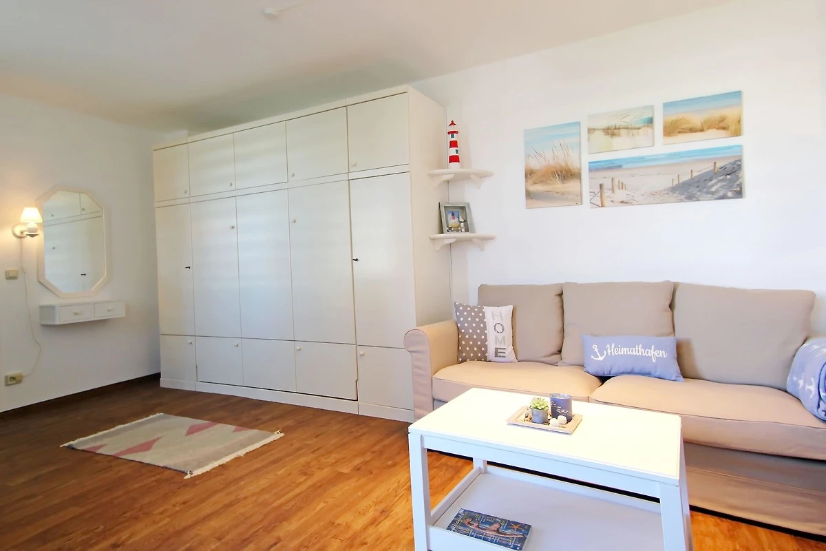 modernes 1 Zimmer Appartement mit ca. 32m² unweit des Hörnumer Golfplatzes; ein Wohn-/Schlafraum mit Doppelschrankbett, Zweisitzer-Couch, 2 Sessel, Tisch, Kommode, Schrank, Sat-TV, Radio mit CD-Player, Zugang zum Westbalkon mit Bestuhlung; kleine separate Pantryküche mit neuem Cerankochfeld (2 Platten), neuer Dunstabzugshaube, Mikrowelle und neuem Kühlschrank mit Gefrierfach; Esstisch für 2 Personen; Flur mit Garderobe und Abstellkammer; neues Duschbad/WC.