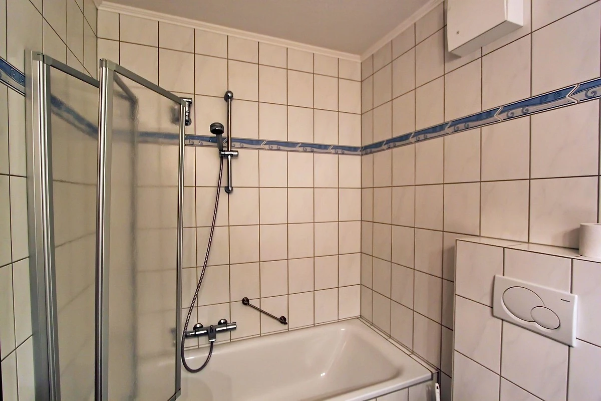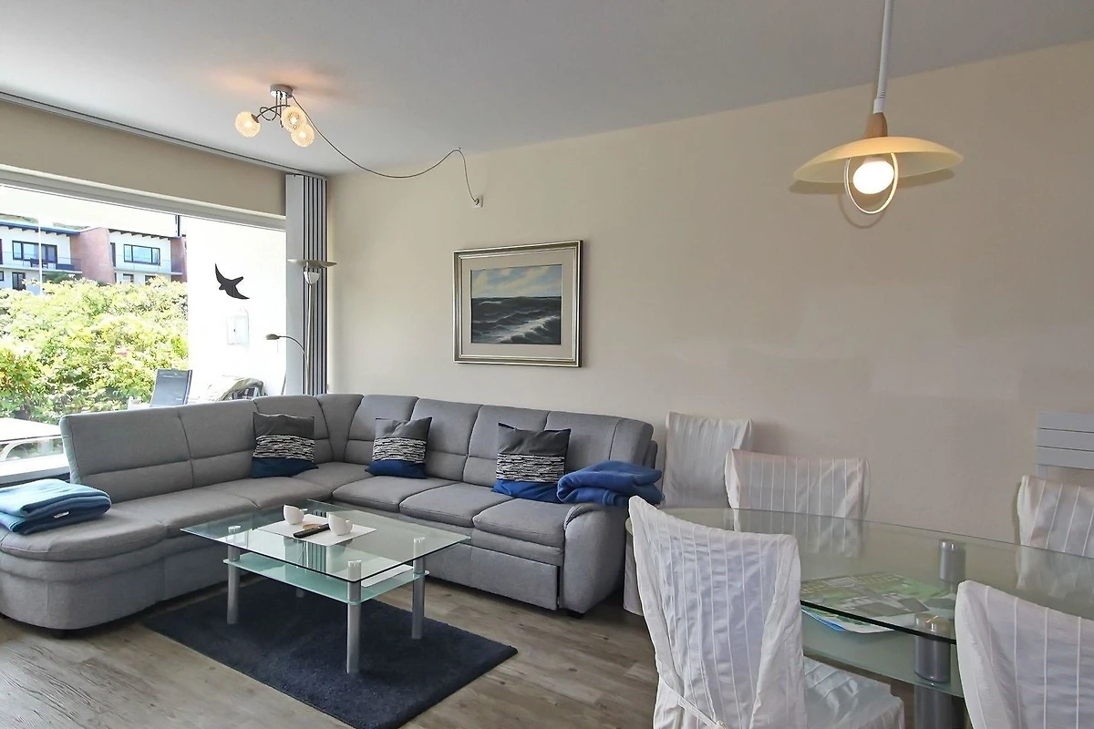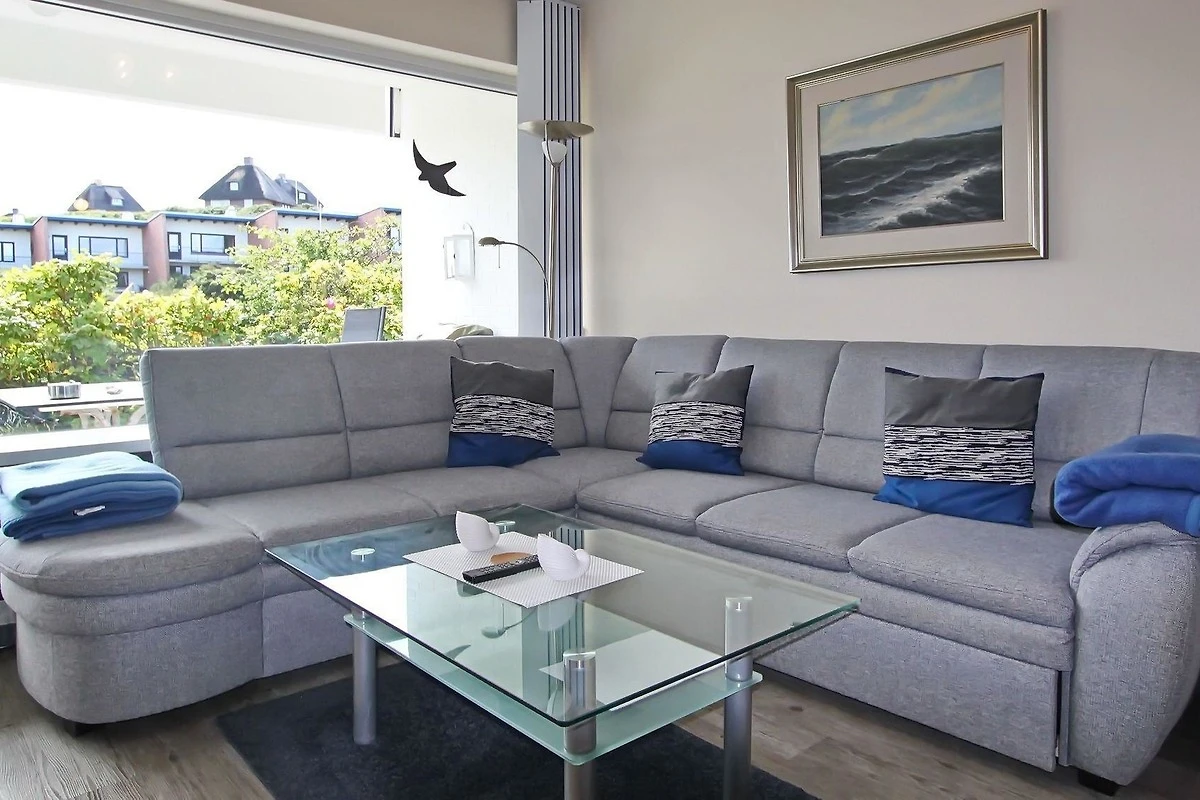 ebenerdig, mit ca. 55qm. Im hellen Wohnraum ist eine grosse, gemütliche Sofaecke, ein Glastisch, eine Kompaktanlage mit Radio u. CD-Player, ein Glasschrank mit SAT-Flat-TV sowie ein Essplatz für 4 Personen. Sie haben einen direkten Zugang zur Südterrasse mit Terrassenmöbel. Die kleine offene Küche mit Ceranfeld, Geschirrspüler, Kühlschrank mit Gefrierfach,Mikrowelle, Kaffeemaschine, Wasserkocher und Toaster bietet alles, um sich selbst zu versorgen.