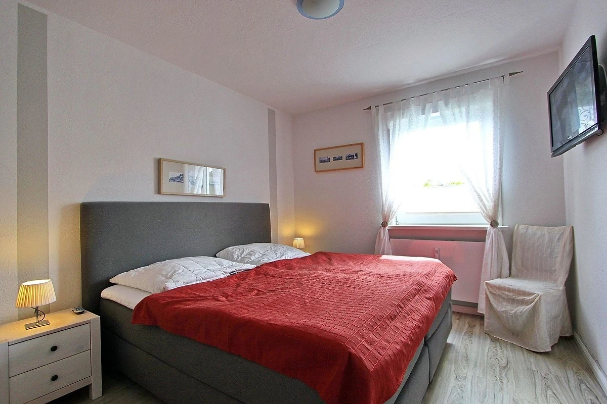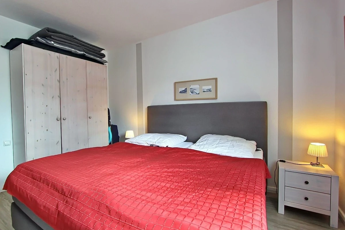 Im kleinen Schlafzimmer befindet sich ein Einzelbett (90 x 200 cm), ein kleiner Nachttisch sowie ein Kindersofa. Im grossen Schlafzimmer befindet sich ein Doppelbett (180 x 200 cm) mit zwei Matratzen, Nachtschränke, ein Stuhl sowie ebenfalls ein Flatscreen-TV. Ein 3-türiger Kleiderschrank bietet ausreichend Stauraum. Das Bad verfügt über ein Wannenbad mit Duschtrennwand sowie ein Waschtisch und das WC.
