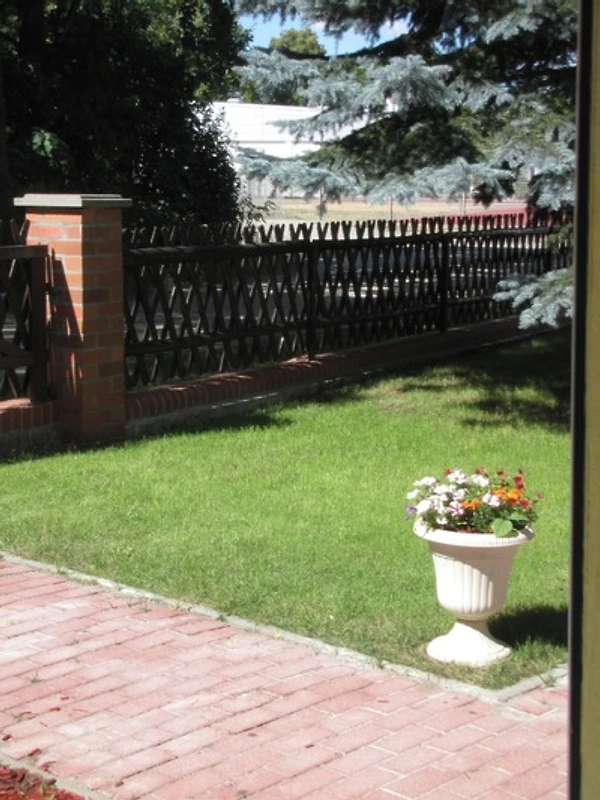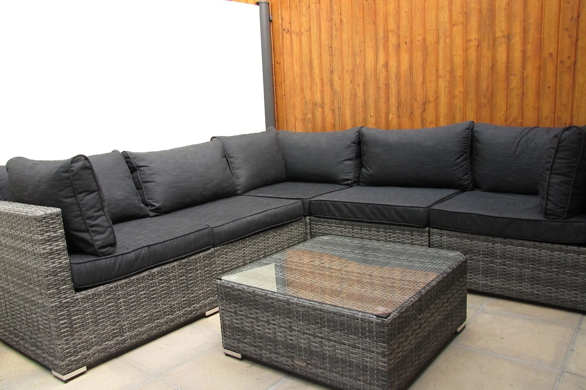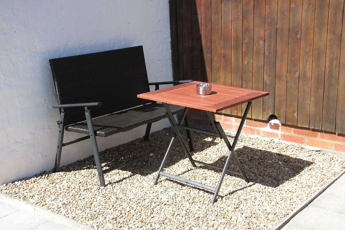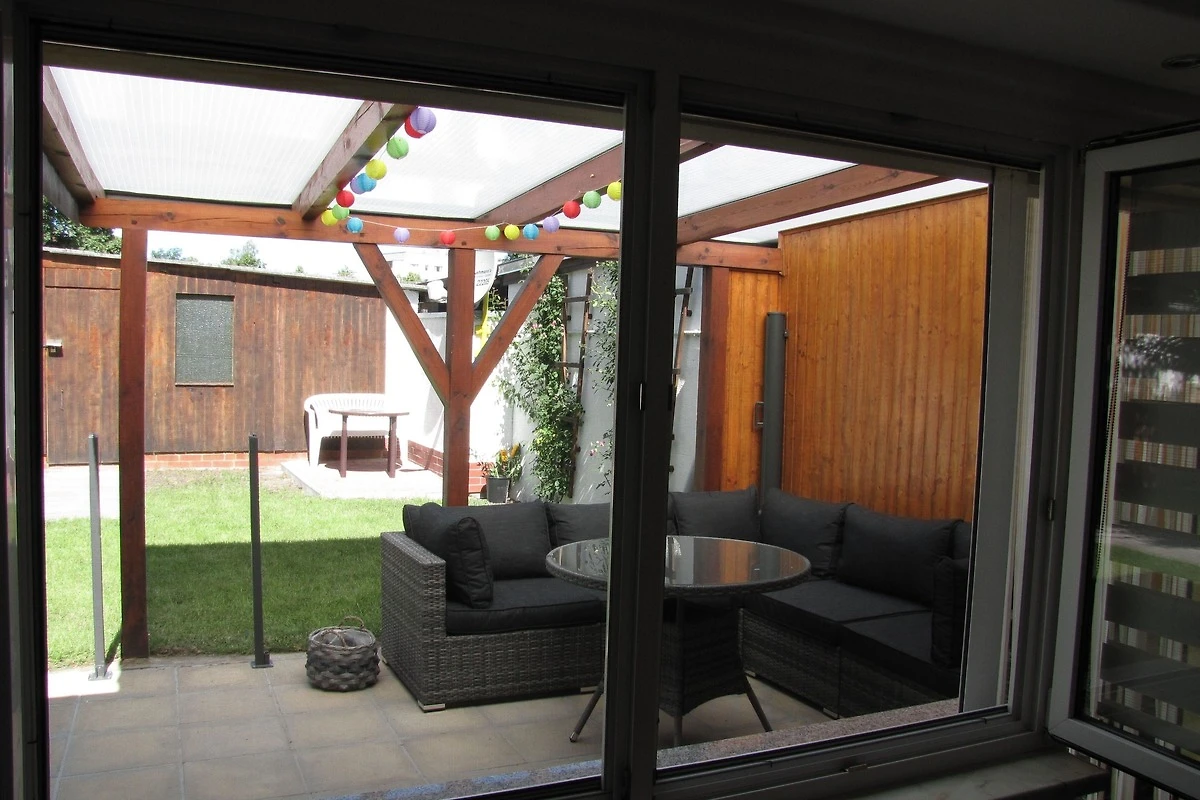 Vom Wohnzimmer aus haben Sie Zugang zu einer überdachten Terasse, auf der Lounge-Möbel zum Entspannen und gemeinsamen Sitzen einladen. Neben der Terasse verfügt der Hof Ihres Urlaubsdomizils auch noch über einen Grillplatz und eine Raucher-Ecke. Das Grudstück ist komplett umzäunt und steht komplett zu Ihrer Verfügung (dies umfasst auch den Garten, der auch als Ausblick aus den Schlafzimmern dient).