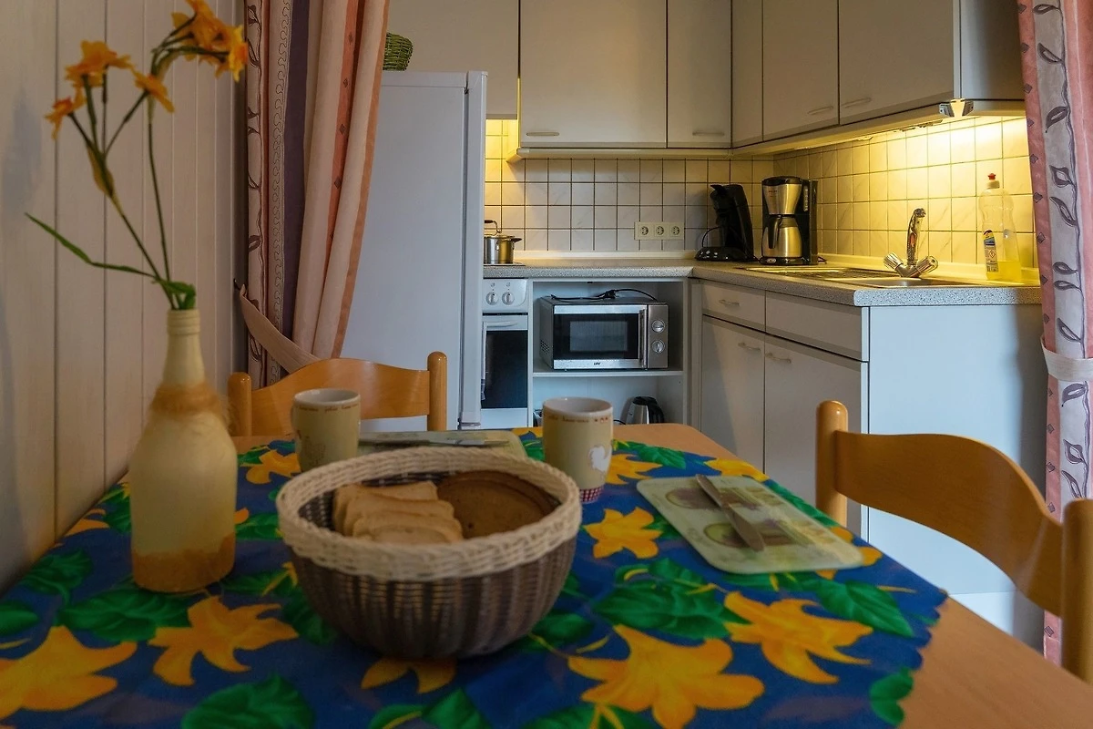 Die Küche ist mit ausreichend Geschirr, Kochutensilien und den notwendigen Elektro-Kleingeräten (Kaffeemaschine, Kaffee-Padautomat, Toaster, Wasserkocher, Eierkocher, Handrührgerät, Raclette- und Fonduegerät) ausgestattet.
