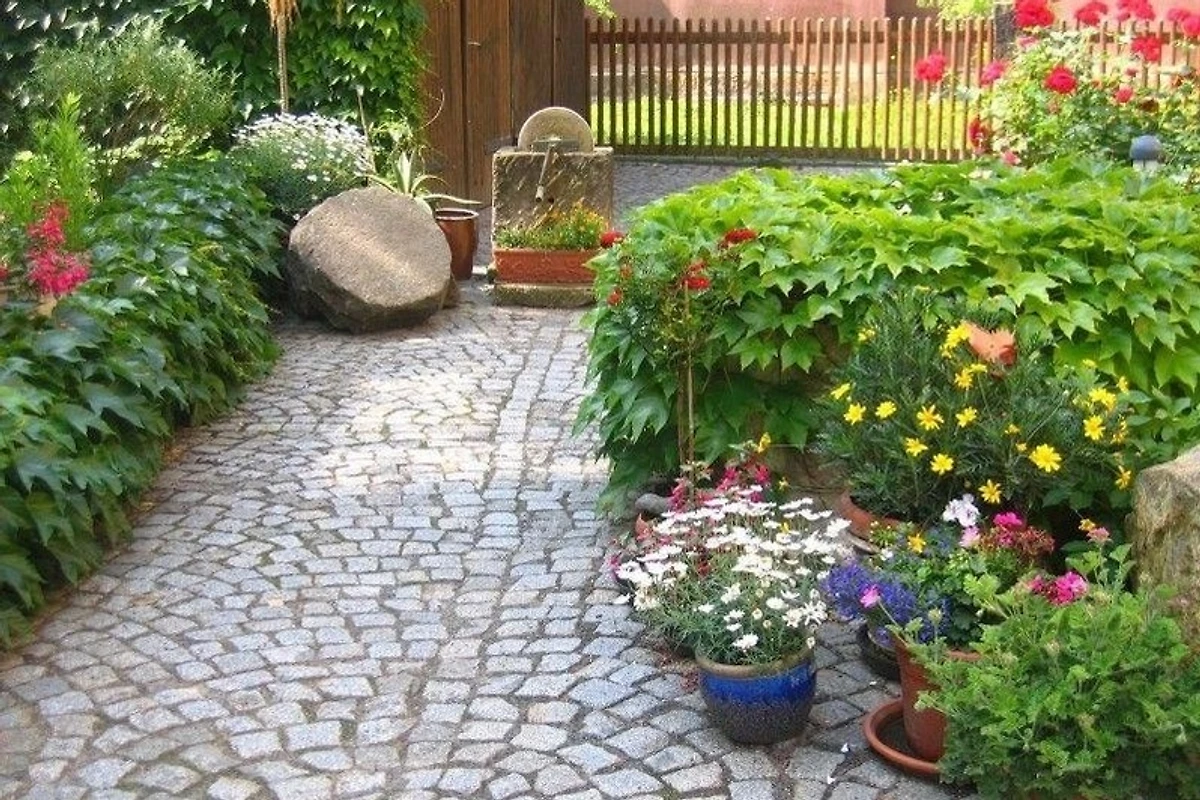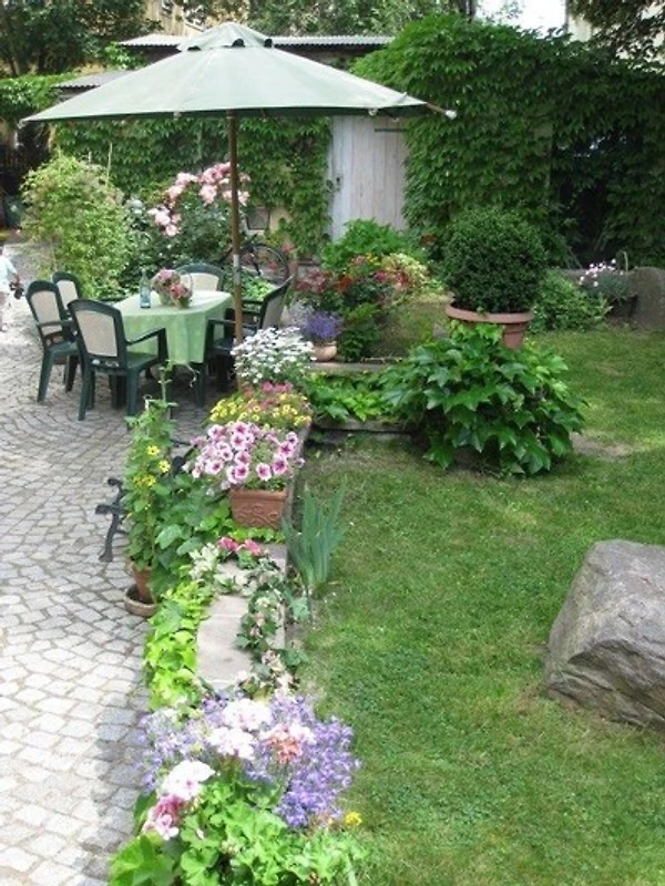Das Haus ist von einem romantisch begrünten Hof mit blühendem Garten umgeben. Für Balkon und Terrasse stehen Ihnen Teakholz-Gartenmöbel zur Verfügung.