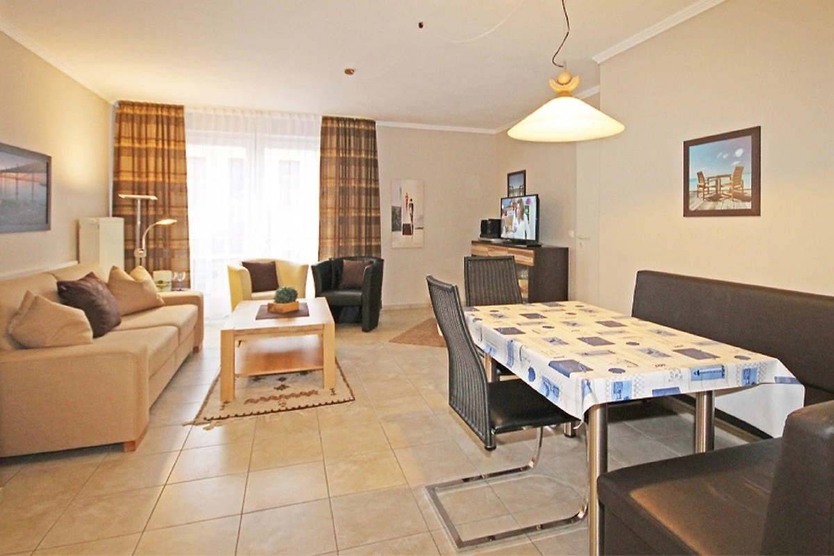 Das Wohnzimmer bietet Ihnen zwei komfortable Sessel und ein bequemes Schlafsofa (145 x 200 cm), welches für eine dritte Person geeignet ist. Für gute Unterhaltung sorgen eine Auswahl an Büchern, ein DVD-Player, eine Stereoanlage sowie ein Flachbild-Fernseher. Eine grosse Essecke ermöglicht es Ihnen hier gemütlich zusammen zu sitzen. Zudem haben Sie, vom Wohnbereich aus, die Möglichkeit den ersten Balkon zu betreten.