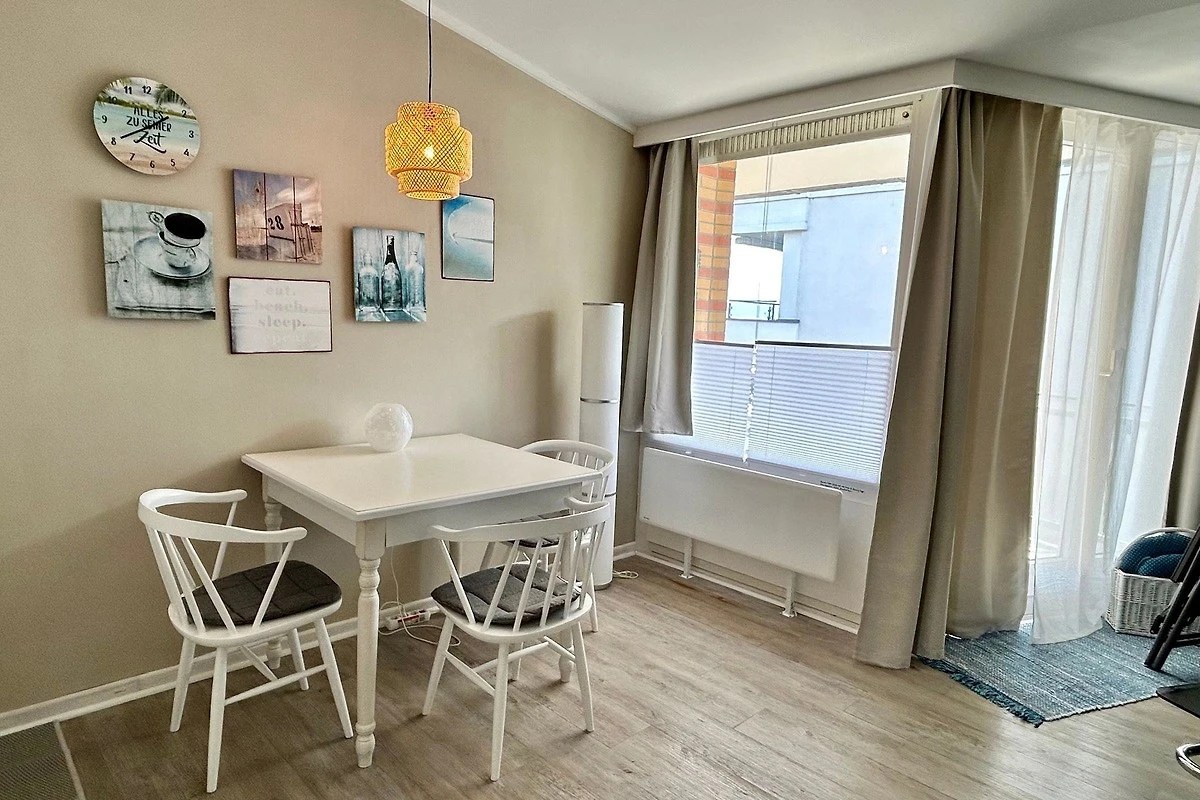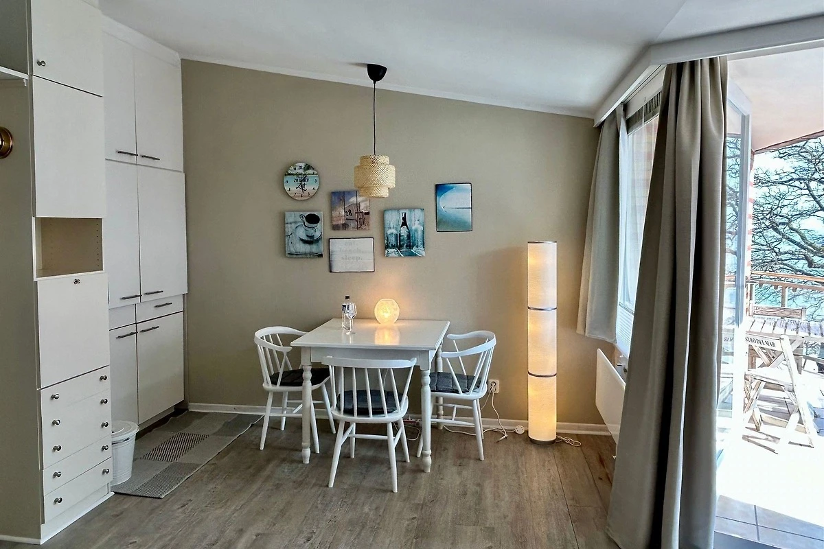 Das Appartement Meerblick befindet sich in der 3. Etage der App.-Anlage Montemare und bietet einen herrlichen Blick auf die Ostsee. Es verfügt über ein angegliedertes Schlafzimmer mit Doppelbett sowie ein helles Wohn-/Esszimmer mit einem Essplatz für vier Personen und einer gemütlichen Sitzecke mit Schlafcouch (160x200 cm). Die teilrenovierte Küche ist ausgestattet mit Herd, Kühlschrank, Kaffeemaschine, Toaster und Wasserkocher. Das Vollbad ist ebenfalls gut ausgestattet. Gemeinschaftliche Einrichtungen sind in der Anlage vorhanden. Die Heizung kann über eine Nachtspeicherheizung geregelt werden, und zur Not steht ein Elektroheizgerät bereit. Das Appartement ist ein Nichtraucherobjekt, Rauchen ist nur auf dem Balkon gestattet. Ein PKW-Stellplatz ist inklusive, jedoch nicht für breite Autos geeignet. Haustiere sind gegen Aufpreis willkommen.