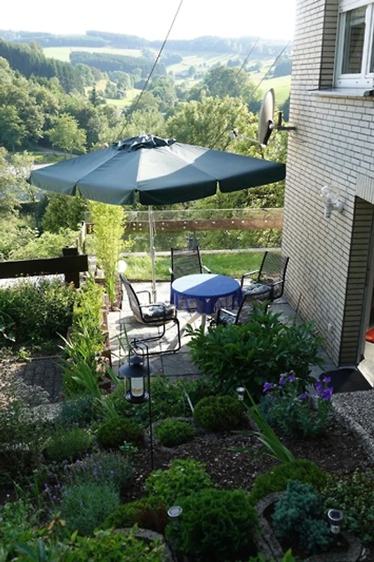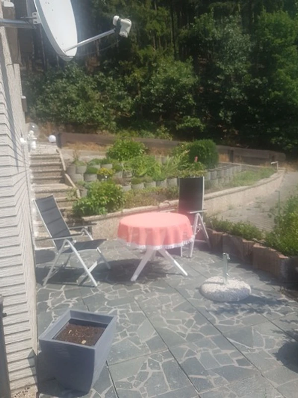 Das Haus verfügt über zwei grosse Terrassen die über eine Aussentreppe erreichbar sind. Gartenmöbel befinden sich im Keller über Aussentreppe , grosse Sonnenschirme, Parkplatz direkt oberhalb am Haus. Der Haupteingang und der Kellerraum mit den Gartenmöbeln ist von der Terrasse aus mit einem Zentralschlüssel zu öffnen.