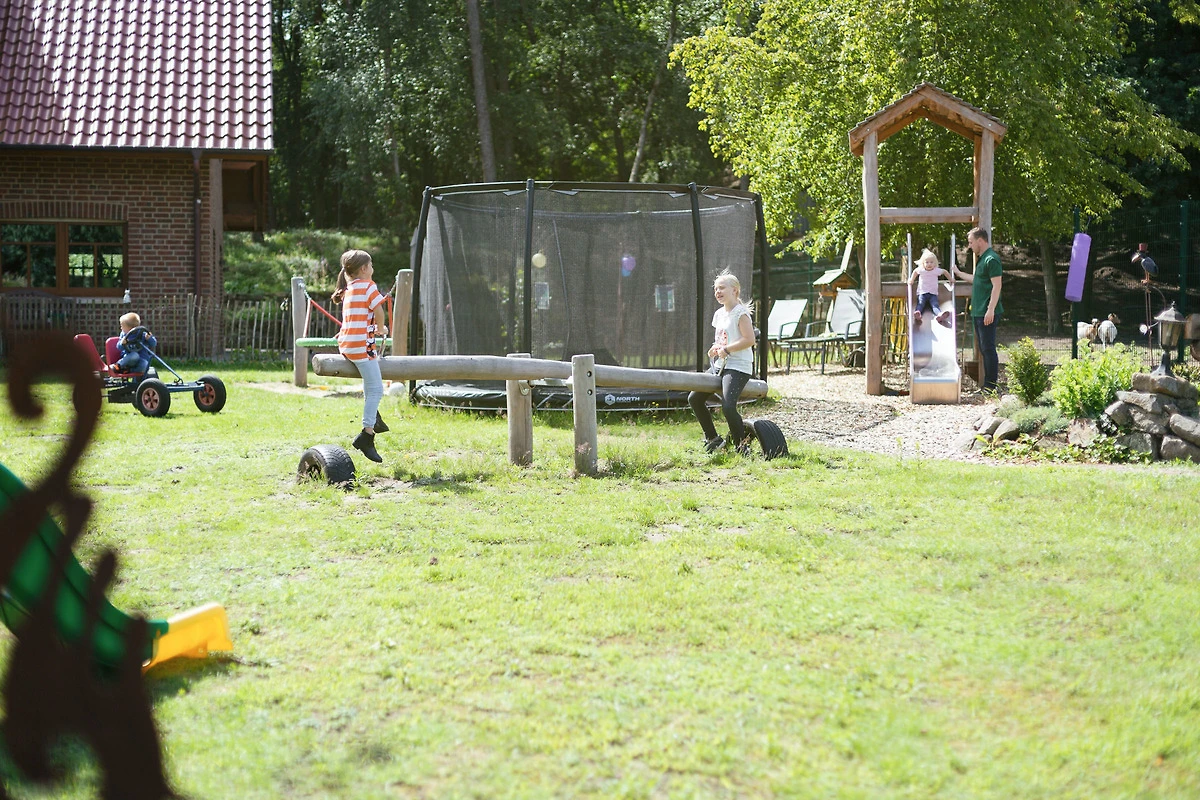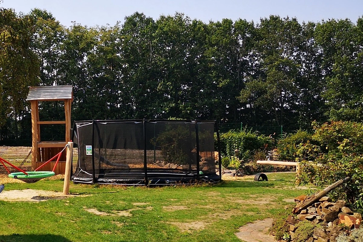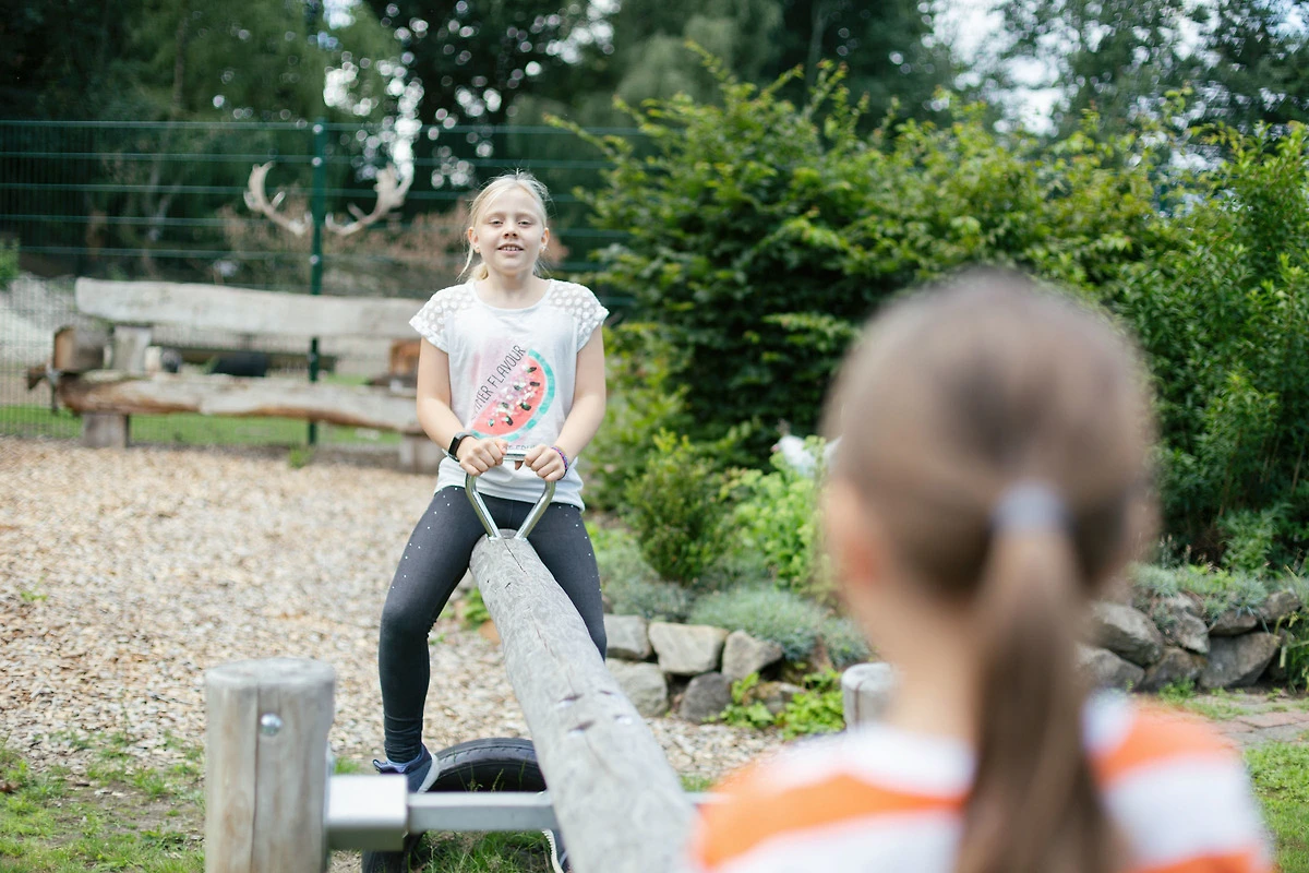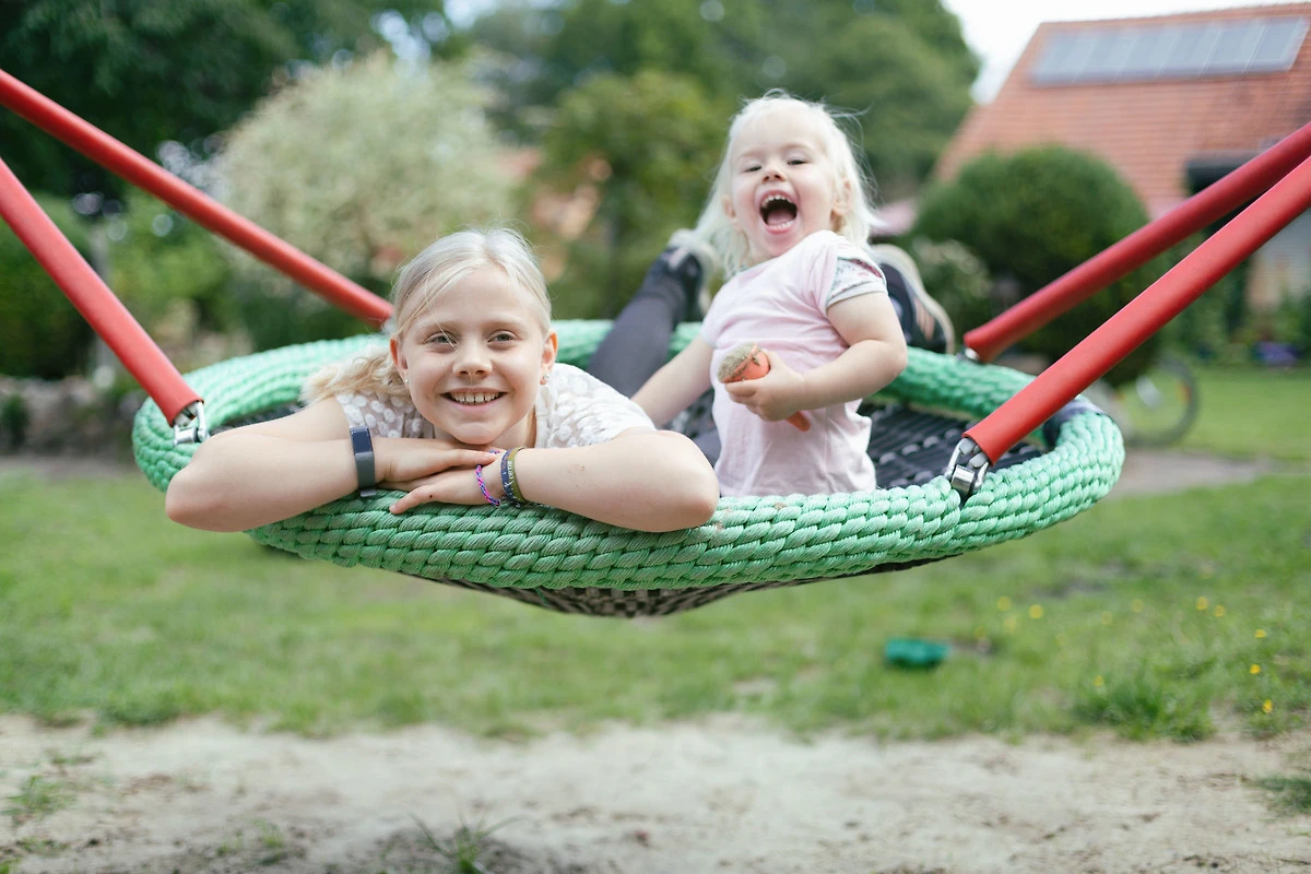 Zwei Kinderspielplätze mit Nestschaukel, Wippe, Bodentrampolin, Kletterturm mit Rutsche, Sandspielzeug, 4 Wipptiere, Sandkasten, 3er Stufenreck, Matschküche, Kletterwand und Kletternetz