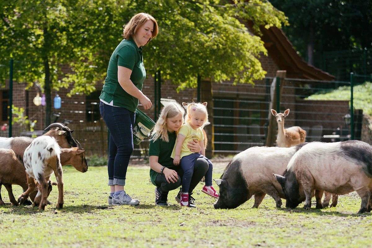 Wir bewirtschaften einen ehemaligen Bauernhof mit eigener Kleintierhaltung mit Damwild/Rehe, Bergziegen, Hängebauchschweine, Hühner, Miniaturesel, Kaninchen, Katzen und Pferden/Ponys.
