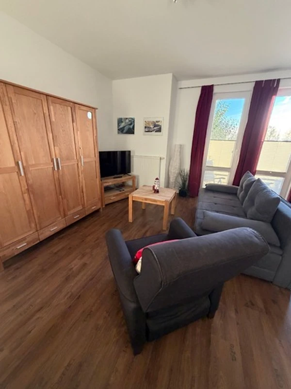 Der sehr grosszügige Wohnraum verfügt über eine Einbauküche, einen Sessel, eine Schlafcouch für 2 Personen und über ein Doppelbett für 2 Personen.
