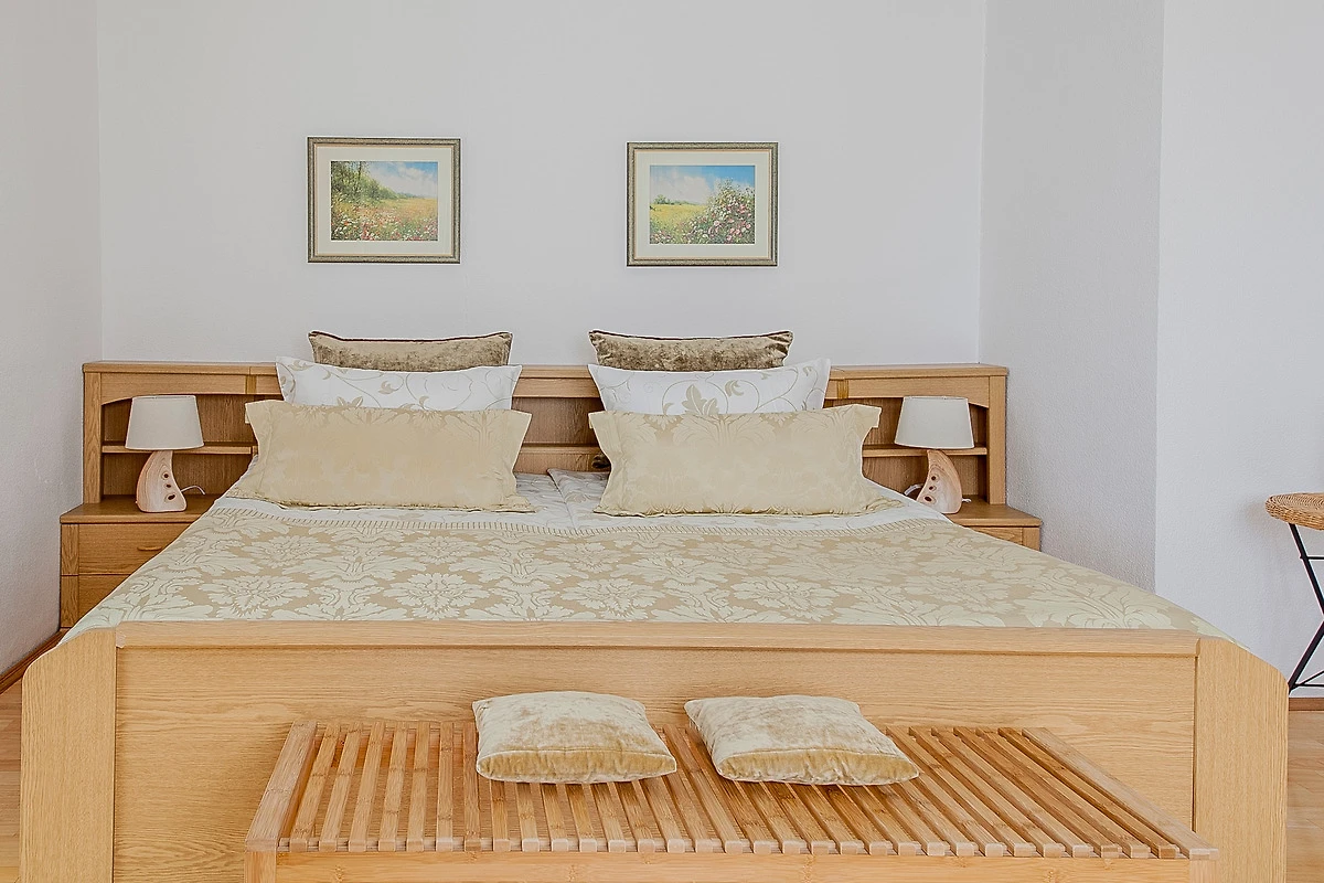 Für einen erholsamen Schlaf finden Sie bei uns ein gemütliches Doppelbett (200x200). Ausserdem bietet das Zimmer ein Einzelbett und die Couch kann zu einem Bett ausgezogen werden.