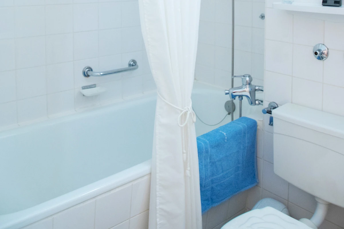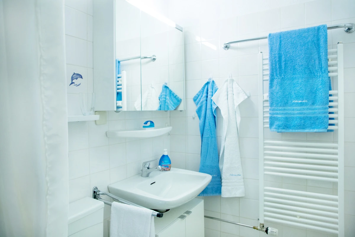 Das Bad verfügt über eine Wanne mit Duschvorrichtung. Mit dem dreiteiligen Spiegelschrank gelingen auch Dirndlfrisuren. Natürlich ist auch ein Fön vorhanden. Mit dem Handtuchstangentrockner ist es schön warm und die Handtücher sind schnell trocken.