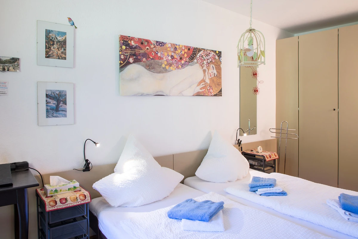 Das Schlafzimmer verfügt über zwei zusammengestellte Einzelbetten (90×200). Natürlich sind 2 Nachttische und Leselampen vorhanden. Am Fenster steht ein kleiner Sekretär zum Schreiben oder Frisieren / Schminken (kleiner Spiegel vorhanden). Ein Korbsessel mit Stehlampe lädt zum Lesen ein. Auf der anderen Bettseite steht ein Herrendiener und der geräumige Kleiderschrank. In dem grossen Spiegel können Sie Ihr Outfit kontrollieren. Im Kleiderschrank befindet sich ein eingebauter Safe.