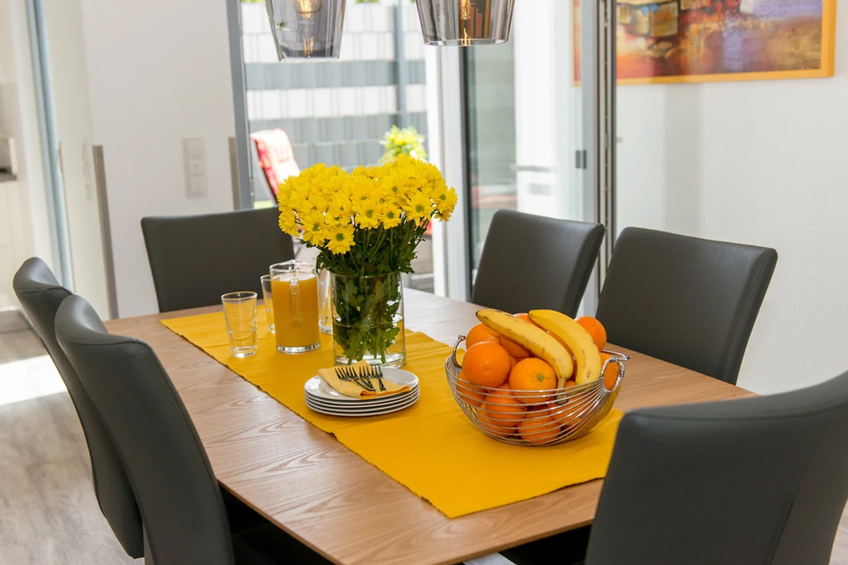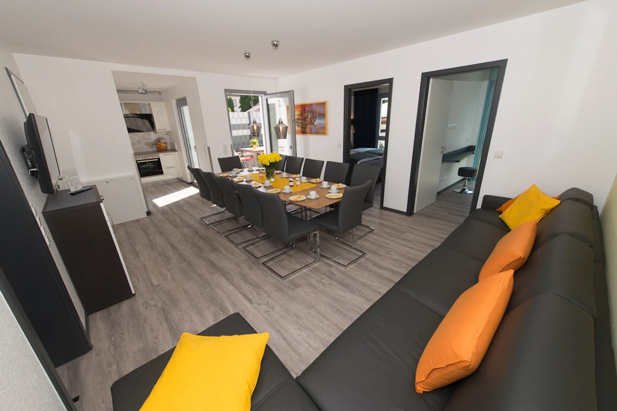 Wohnbereich: Wohnraum mit Esstisch (verlängerbar für Gruppen bis 12 Personen) und 2 x Sofa-Bett, 42-Zoll-Flatscreen-TV, Wohnen-Extras: direkter Zugang zur Gartenterrasse, extra grosser Couchbereich.
