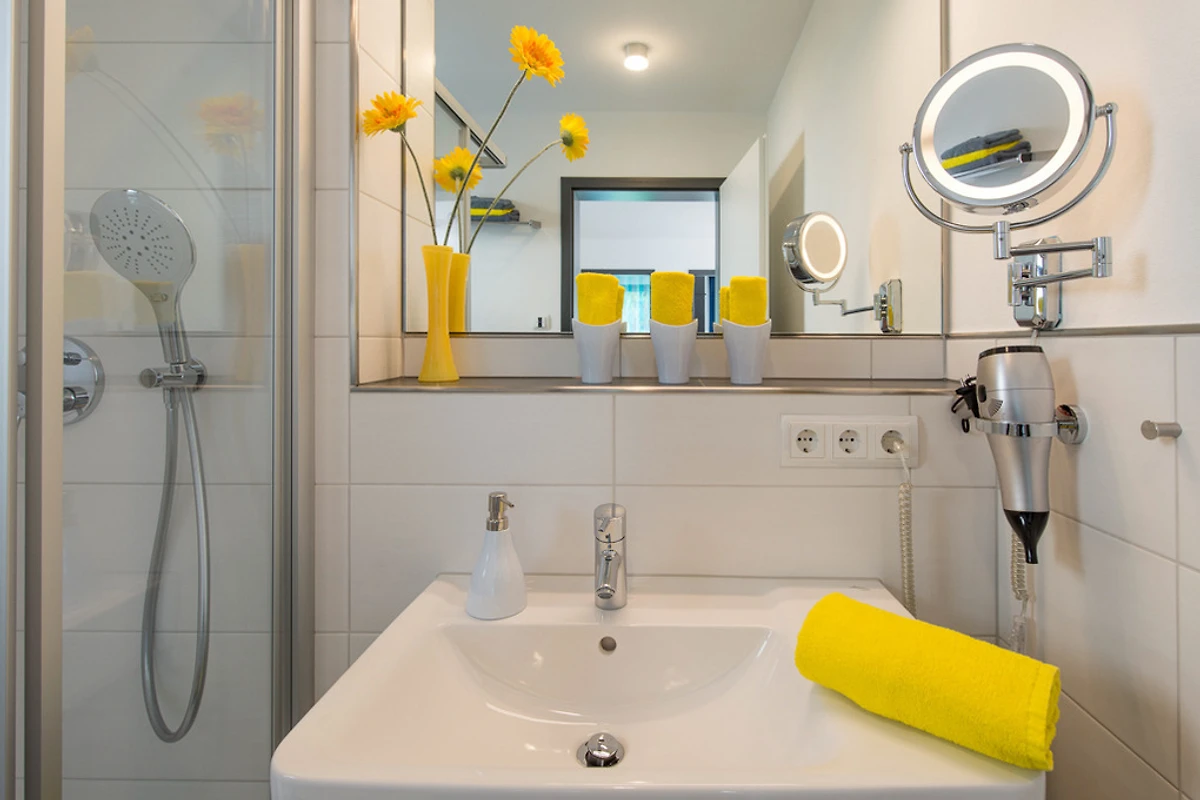 Bad-Extras: Kosmetikspiegel, Pflegeprodukte (Handseife+Dusch-Shampoo), Handtuchwechsel auf Wunsch.