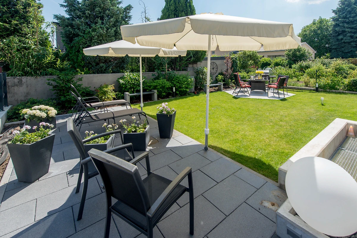 Aussenbereich: Garten-Terrasse mit grossem Sitzbereich und Zugang zum Garten.