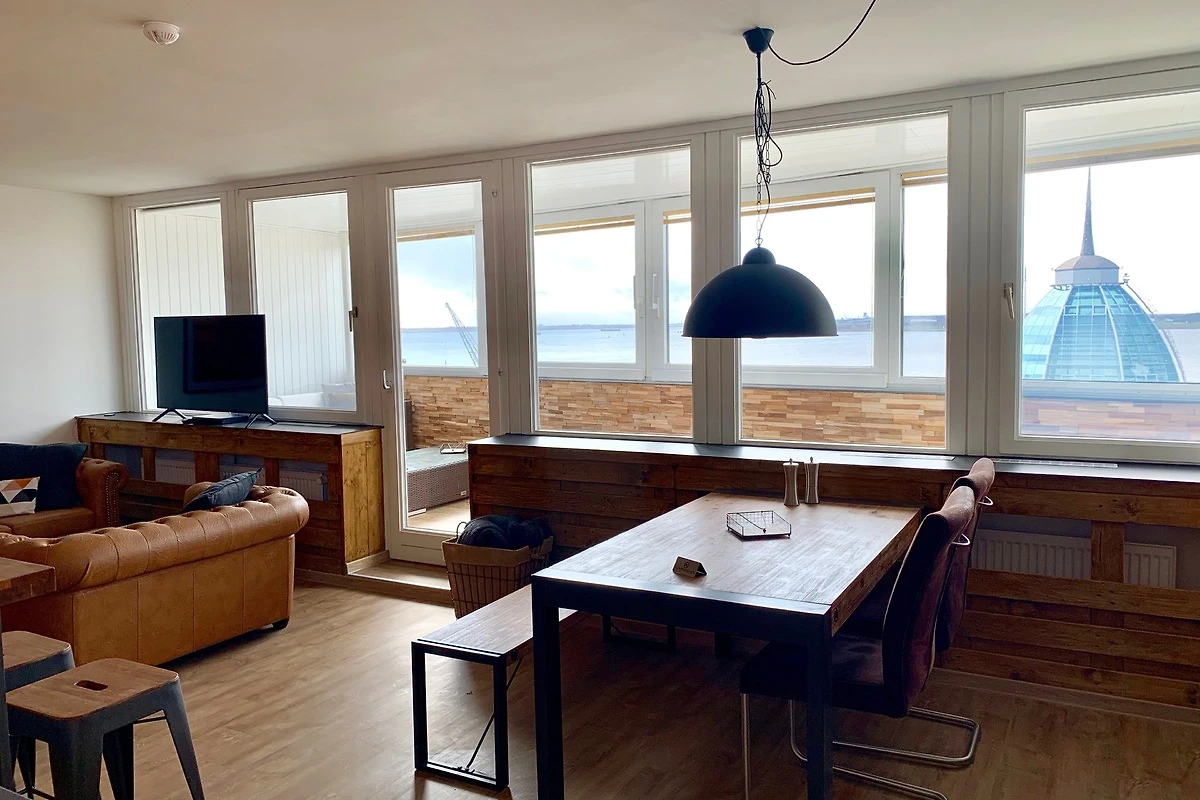 Grosse verglaste Lounge-Loggia mit aufziehbaren Fenstern und Meerblick