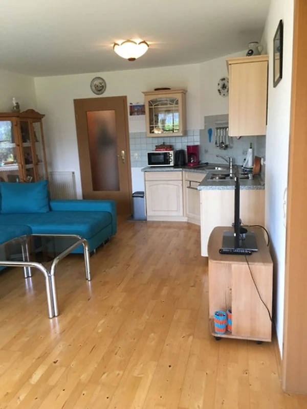 Das Bad und der Flur der hellen Wohnung sind gefliest. Im Wohn- und im Schlafzimmer ist Parkett verlegt. Das Doppelbett im Schlafzimmer ist mit Taschenfederkernmatratzen ausgestattet und die Liegefläche des Verwandlungssofa mit Federkern.