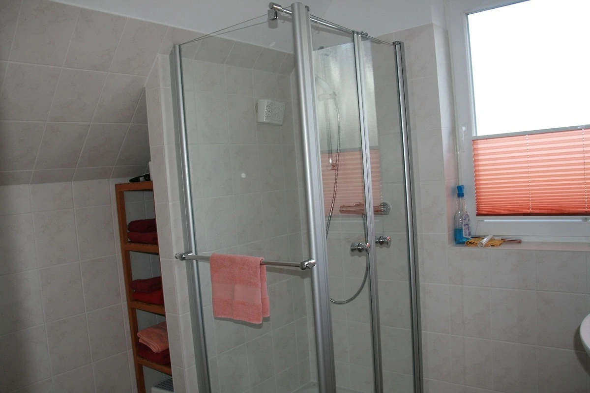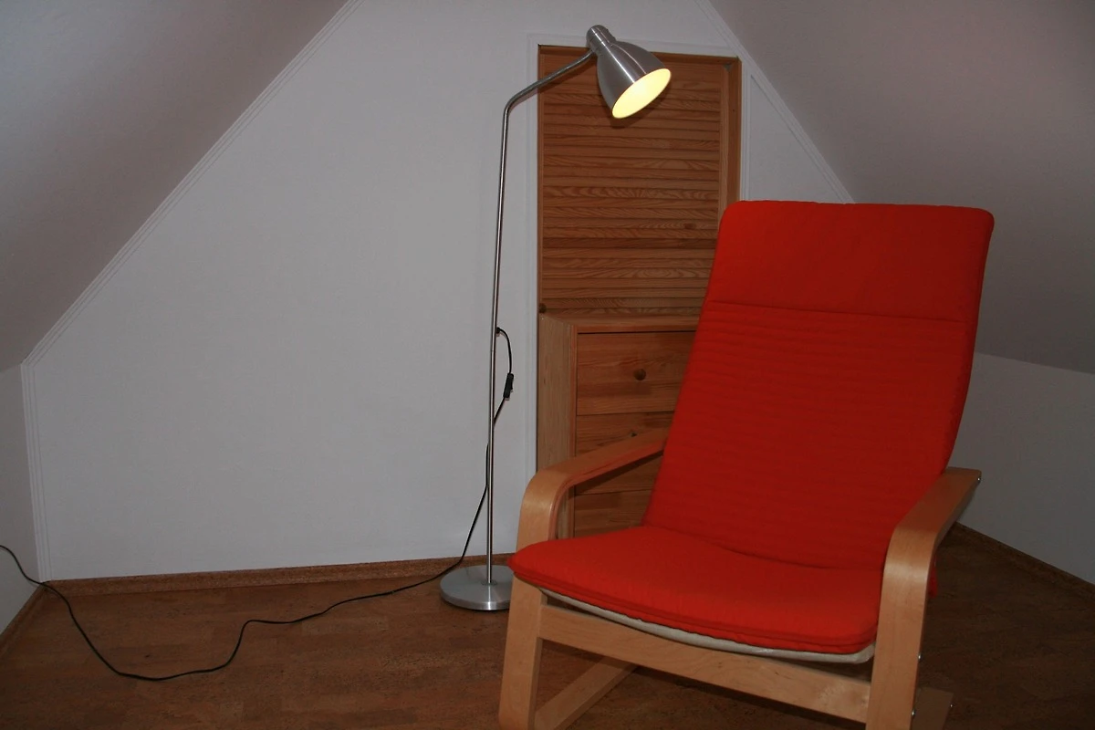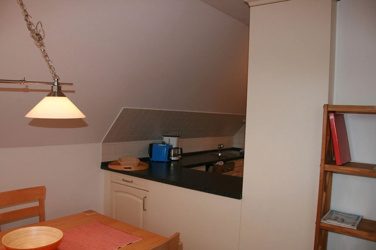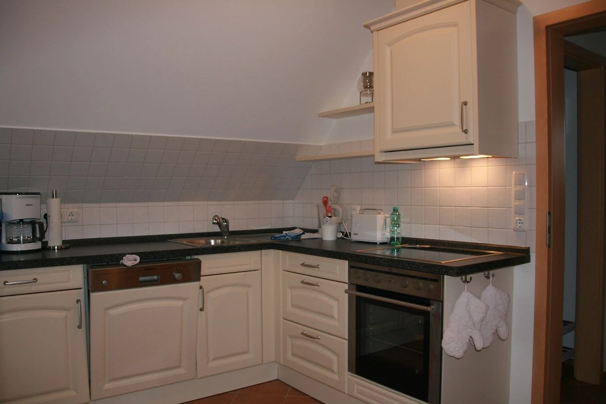 Die Ferienwohnung "Veit" befindet sich im OG. Mit ca. 60 qm² und 2 Schlafzimmern. Ein Schlafzimmer befindet sich im gemütlichen Spitzboden zu dem eine steile Raumspartreppe führt. Wegen der steilen Raumspartreppe, sollten dort nur Kinder ab 5 Jahre schlafen !! Die Wohnung "Veit" besitzt einen grossen Süd-Balkon . Die Wohnung wurde mit viel Liebe und Sorgfalt ausgestattet. Sie verfügt über eine offene Küche mit Geschirrspüler, Mikrowelle, Ceranfeldherd und Backofen. Selbstverständlich gibt es Sat-TV , sowie W-Lan. Für unsere kleinen Gäste stellen wir Hochstuhl, Kinderbett kostenlos zur Verfügung.