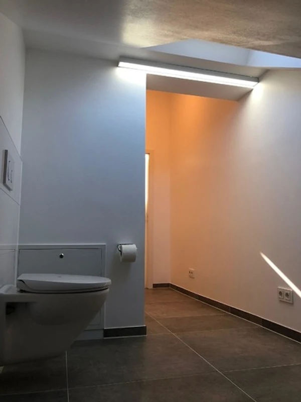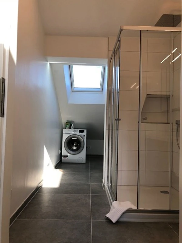 Das geräumige Tageslichtbad beeindruckt mit einer grosszügigen Dusche, Waschbecken und WC. Hier steht Ihnen auch eine Waschmaschine zur Verfügung, damit Sie Ihren Aufenthalt in vollen Zügen geniessen können.