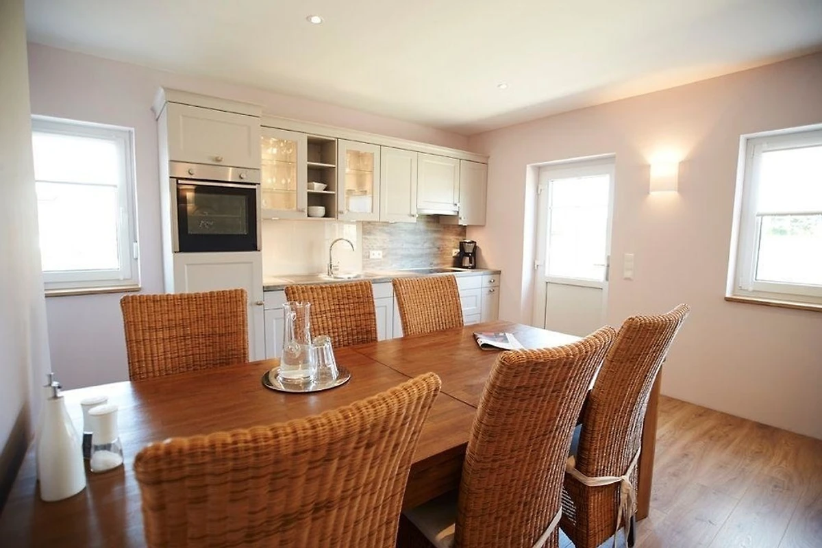 Insgesamt vermieten wir zwei Doppelzimmer mit jeweils Dusche, WC und Fön. Alle Räume sind barrierefrei und Rollstuhlfreundlich. Für beide DZ steht eine gemütliche Wohnküche zur Verfügung. Die Markenküche ist sehr gut ausgestattet mit Backofen, Spülmaschine, Kühlschrank und Ceranfeld von Miele und Neff. Kaffeemaschine und Tee, sowie Wasserkocher und Toaster vervollständigen die Küche.