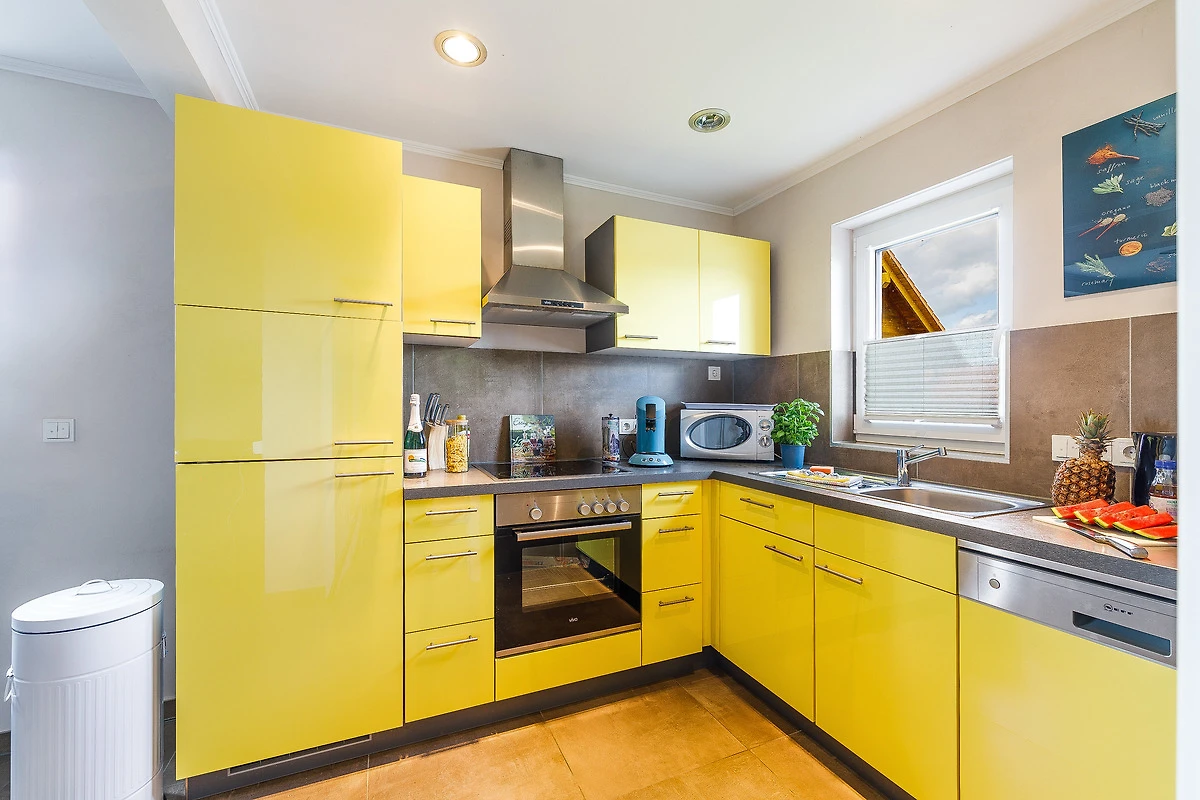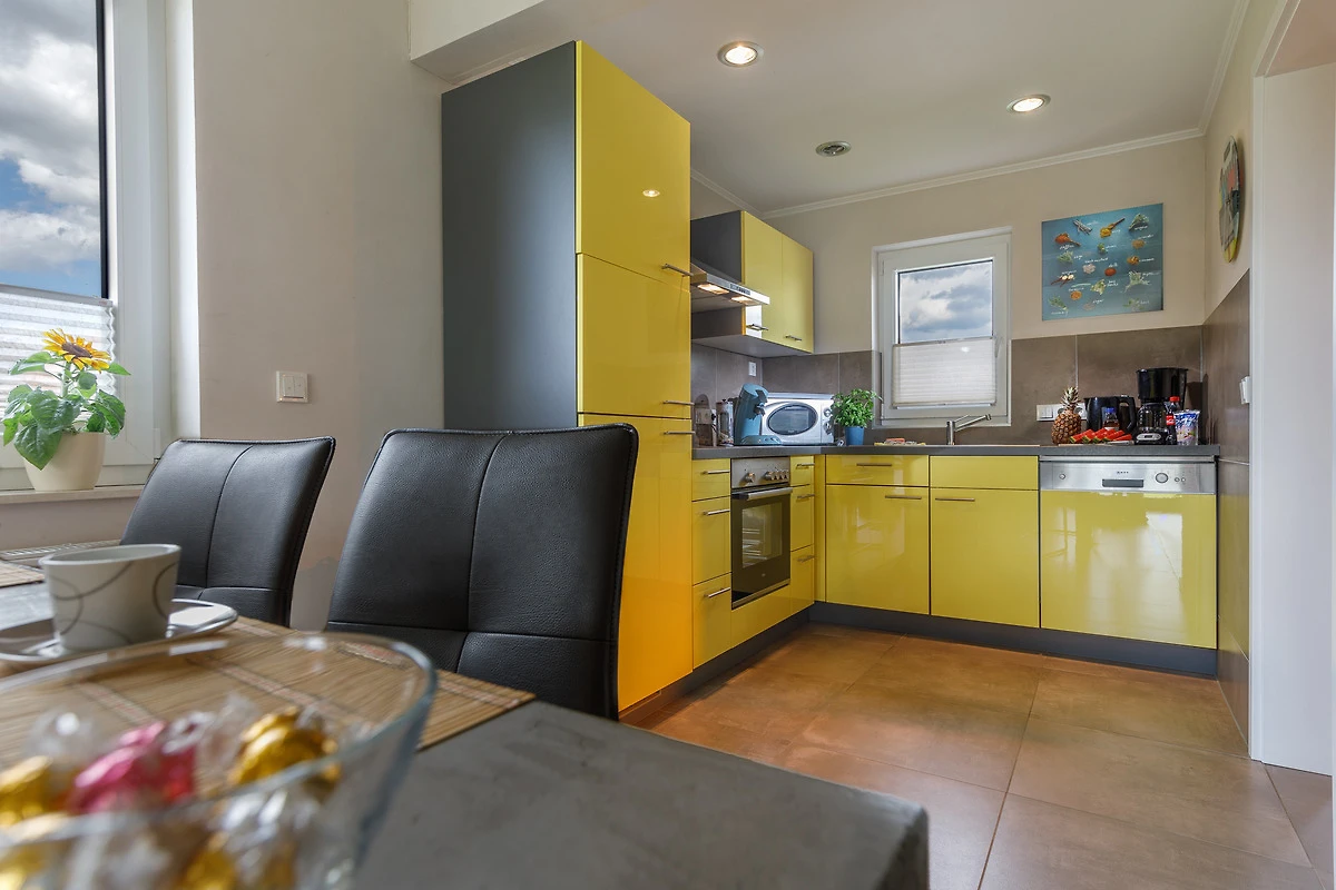 mit Geschirrspüler, Ceranherd mit Backofen, Mikrowelle, Kühl-/Gefrierkombination, Toaster, Kaffeemaschine, Padmaschine und vielem mehr.