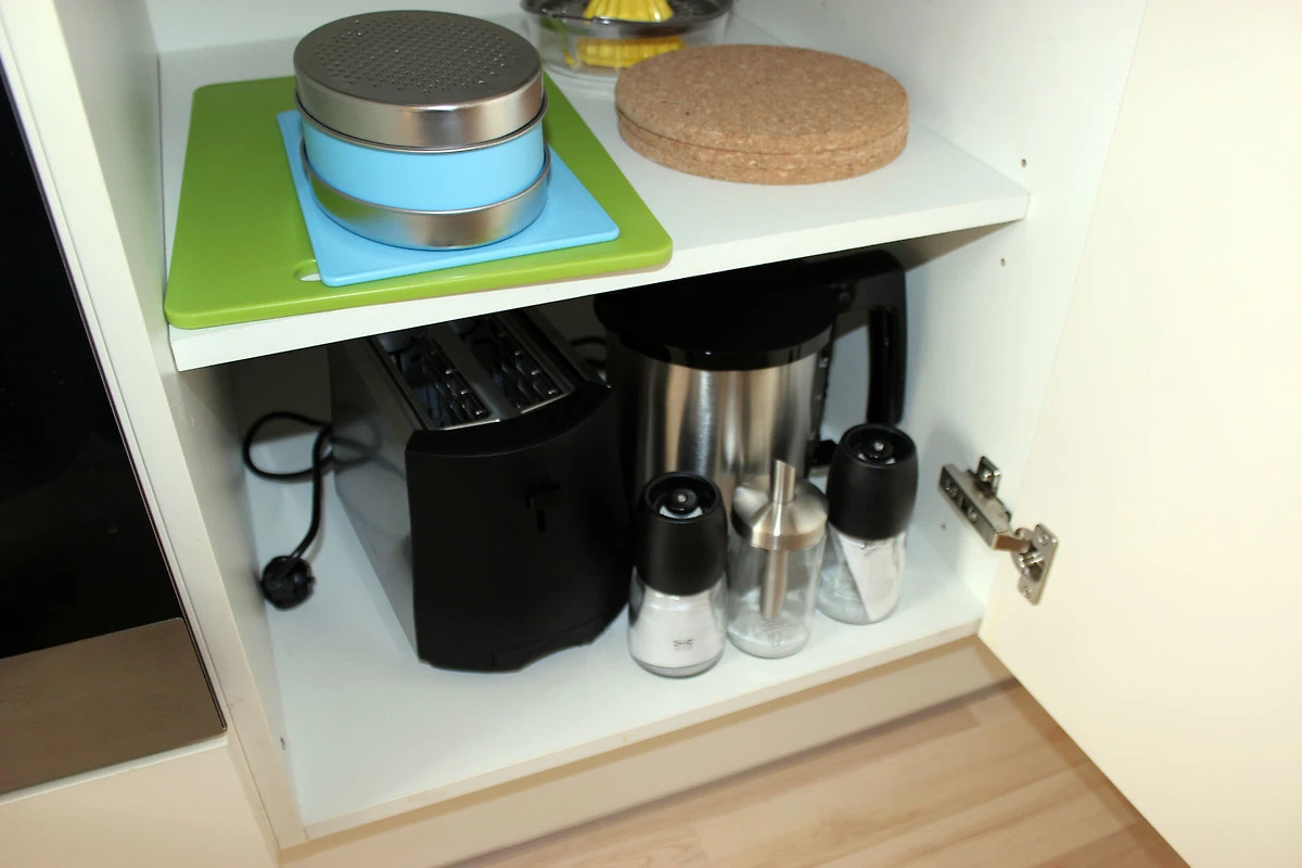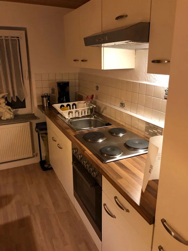 1 Küche (Herd mit vier Kochfeldern, Backofen, Kühlschrank, Kaffeemaschine für Filterkaffee, Toaster, Wasserkocher, Kaffeepulver, Kaffeesahne, Salz, Pfeffer, Zucker, Essig und Olivenöl inkl. Geschirr, Besteck siehe Bilder) ,