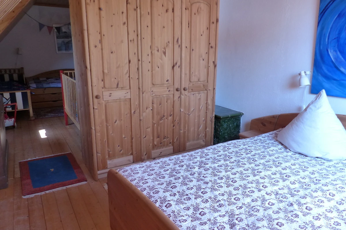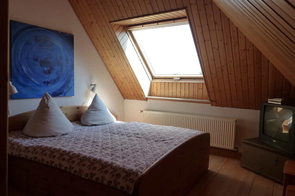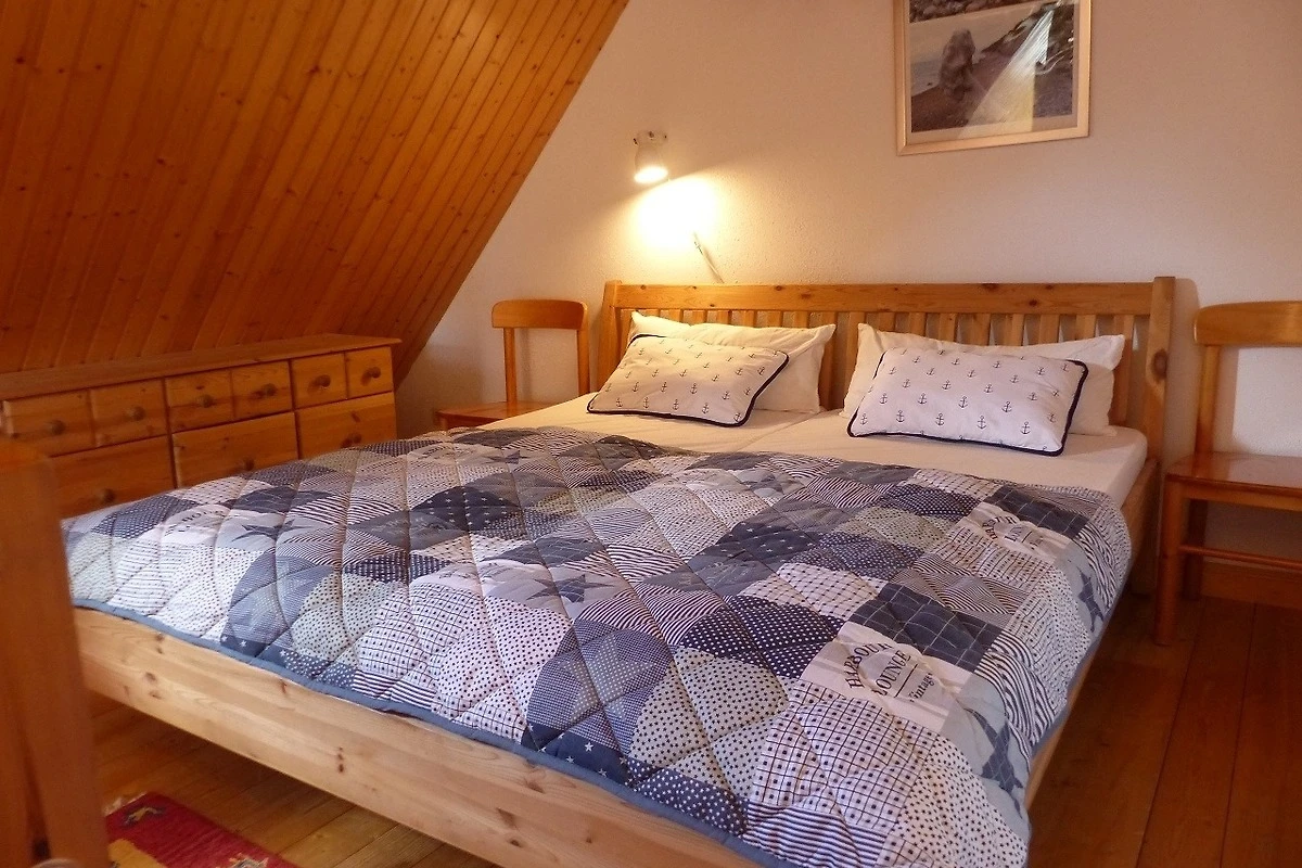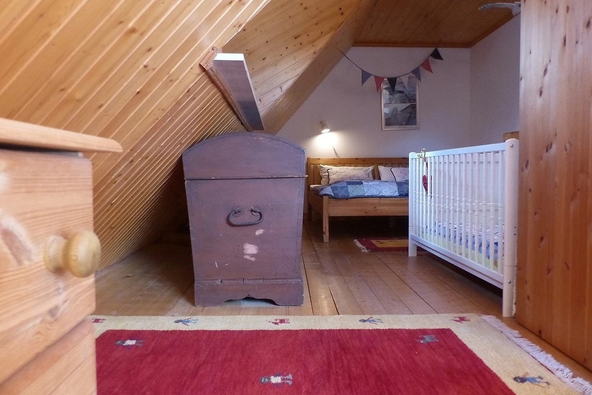 Den hellen offenen Schlafbereich, mit maximal 4 Schlafplätzen plus Baby im Dachgeschoss, erreichen sie über eine schmale, viertelgewendelte Treppe. Das grosse Doppelbett ist hier vom ausziehbaren Friesenbett durch Raumteilung abgetrennt.