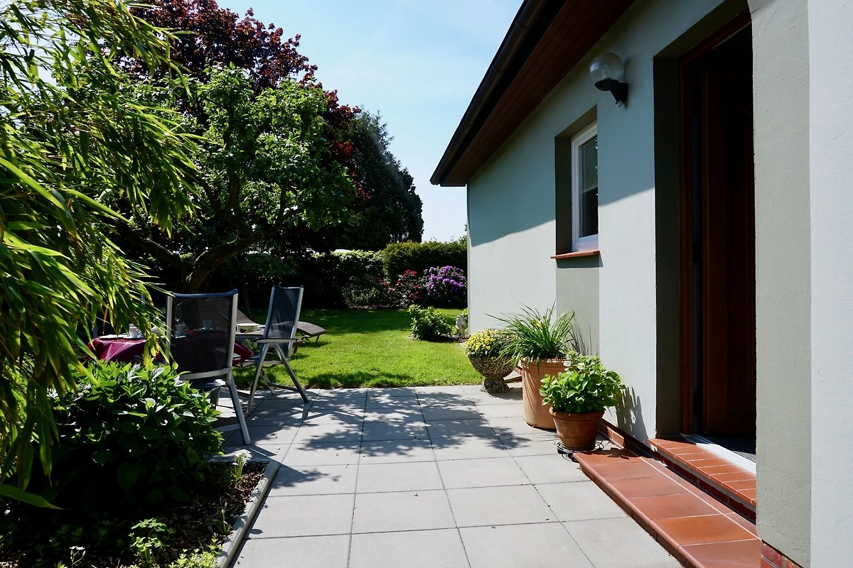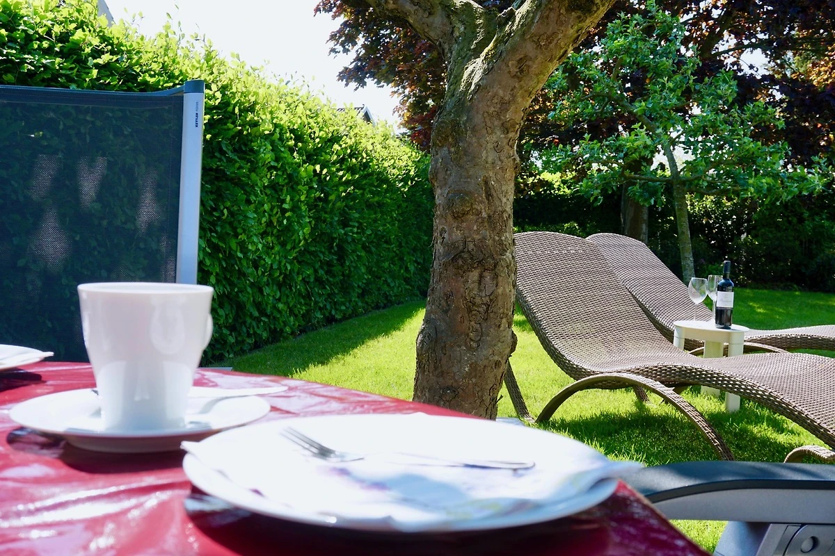 Die zentral gelegene und ebenerdige Ferienwohnung hat über die schöne Terrasse einen Zugang zum Garten. Nehmen Sie also Platz und geniessen Sie den Ausblick ins Grüne. Der Garten ist zudem mit einer Sichtschutzhecke eingefasst, und der schöne Busch- und Baumbestand verspricht Entspannung pur.