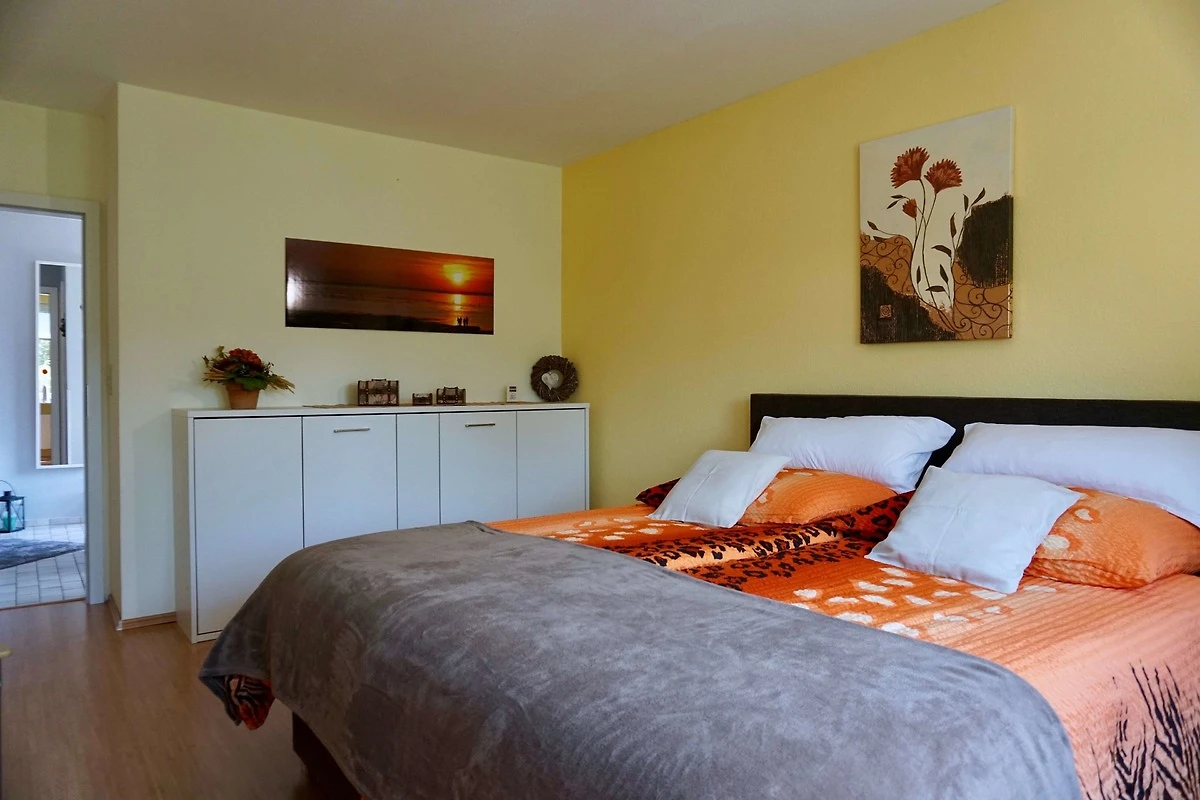 Die mit WLAN ausgestattete Wohnung besteht aus einem Schlafzimmer mit gemütlichem Boxspringbett und einem zusätzlichen Schrankbett – von hier aus können Sie abends TV schauen und die schönen Erlebnisse des Tages Revue passieren lassen.