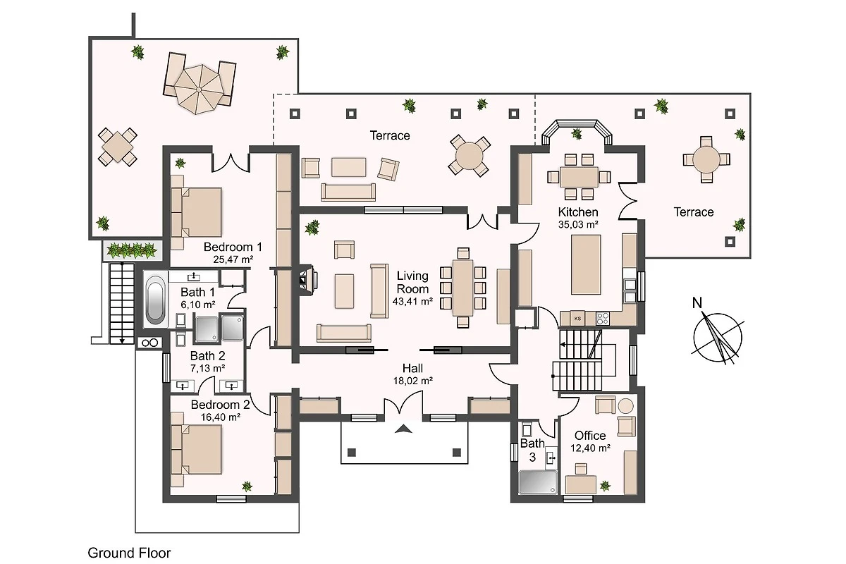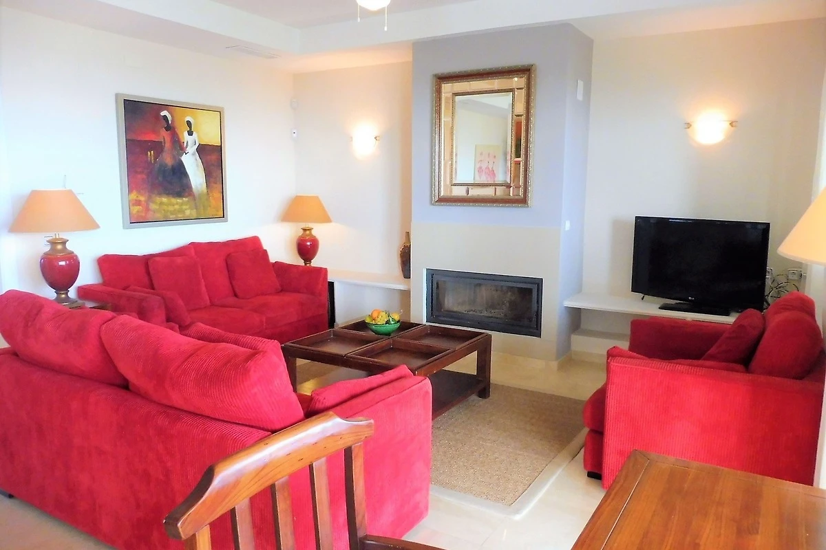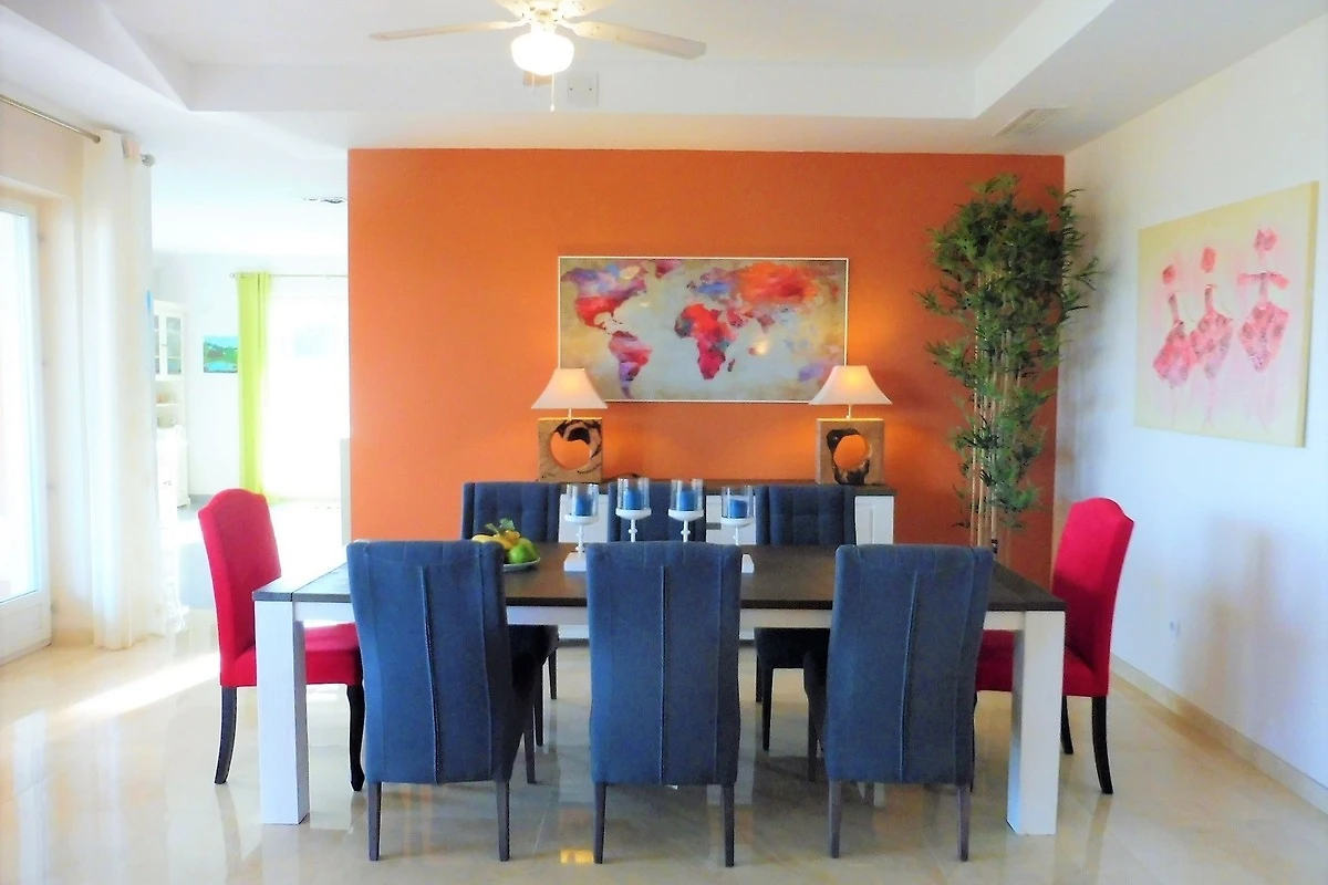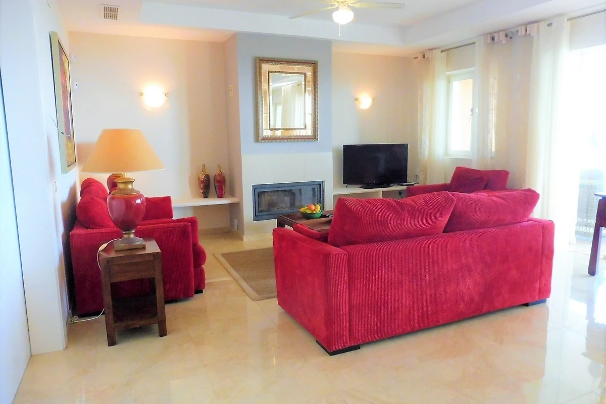 Die Villa wurde sehr grosszügig und luftig gebaut, alle Zimmer sind sehr gross und hell. Im Erdgeschoss befindet sich der Eingangsbereich, ein riesiges Wohn-Esszimmer mit Kamin und Ausblick über die gesamte nahe Küste, die komplett ausgestattete Küche mit zweitem Essbereich, ein Büro mit Gäste-WC und am anderen Ende des Ganges sind die zwei unteren Schlafzimmer: jedes mit eigenem en-Suite-Vollbad und eingebauten Wandschränken. Küche und Wohnzimmer haben direkten Zugang zur Hauptterrasse und somit zum Garten und Pool. Auf der Terrasse finden Sie bequeme Lounge-Garnitur und 2 Esstische.