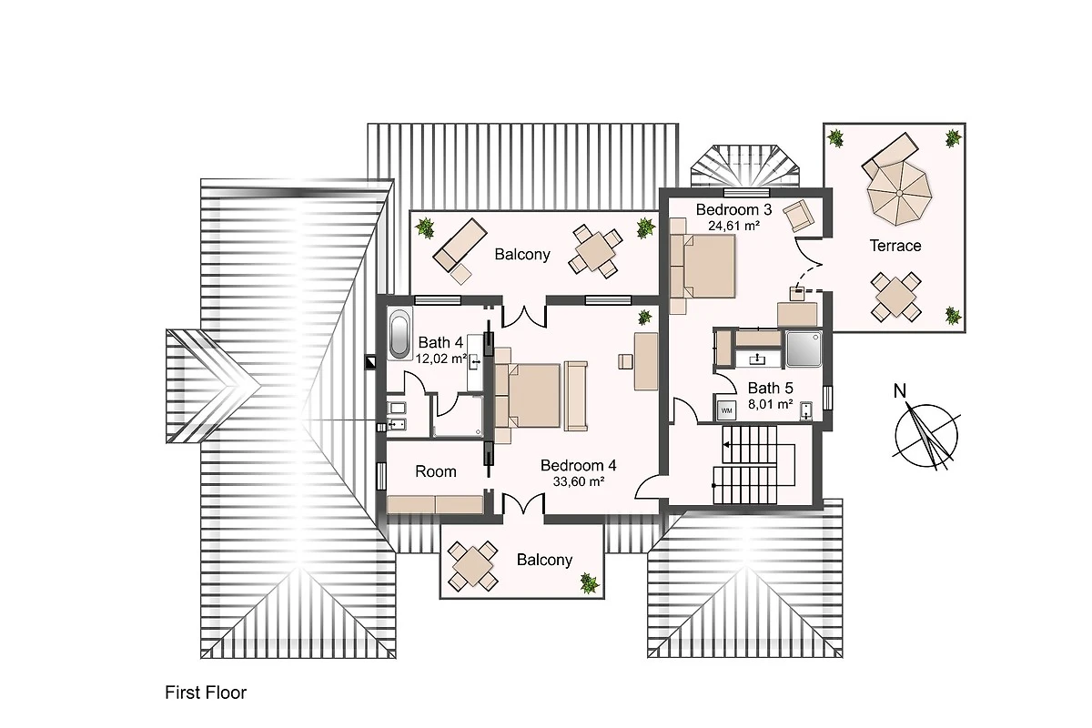 Im Obergeschoss befindet sich das riesige Hauptschlafzimmer mit begehbarem Kleiderschrank, en-suite-Vollbad und zwei grossen Terrassen! Das vierte Schlafzimmer bietet ebenfalls ein grosses en-suite-Duschbad und eine Terrasse welche den Pool überblickt.