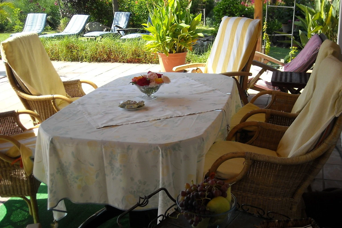 Die Poolterrasse hat einen direkten Zugang zur Küche und einen überdachten Essbereich, zusätzlich gibt es noch eine überdachte Terrasse zur Westseite und eine Teilweise Sonnengeschützte Sitzgelegenheit nach Südosten.