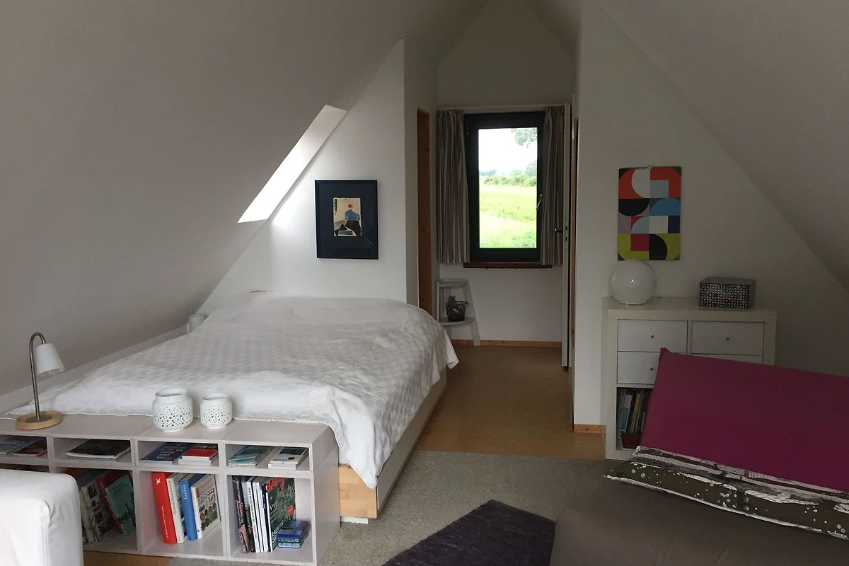 Unsere Ferienwohnung befindet sich als Maisonette- Wohnung in einem separat zugänglichen Holzhaus direkt neben dem reetgedeckten Haupthaus. Abgewandt vom privaten Bereich befindet sich die Terrasse derselben. Aber auch vor der Eingangstür lässt sich gut sitzen und schnacken. Geparkt werden kann auf dem Grundstück.