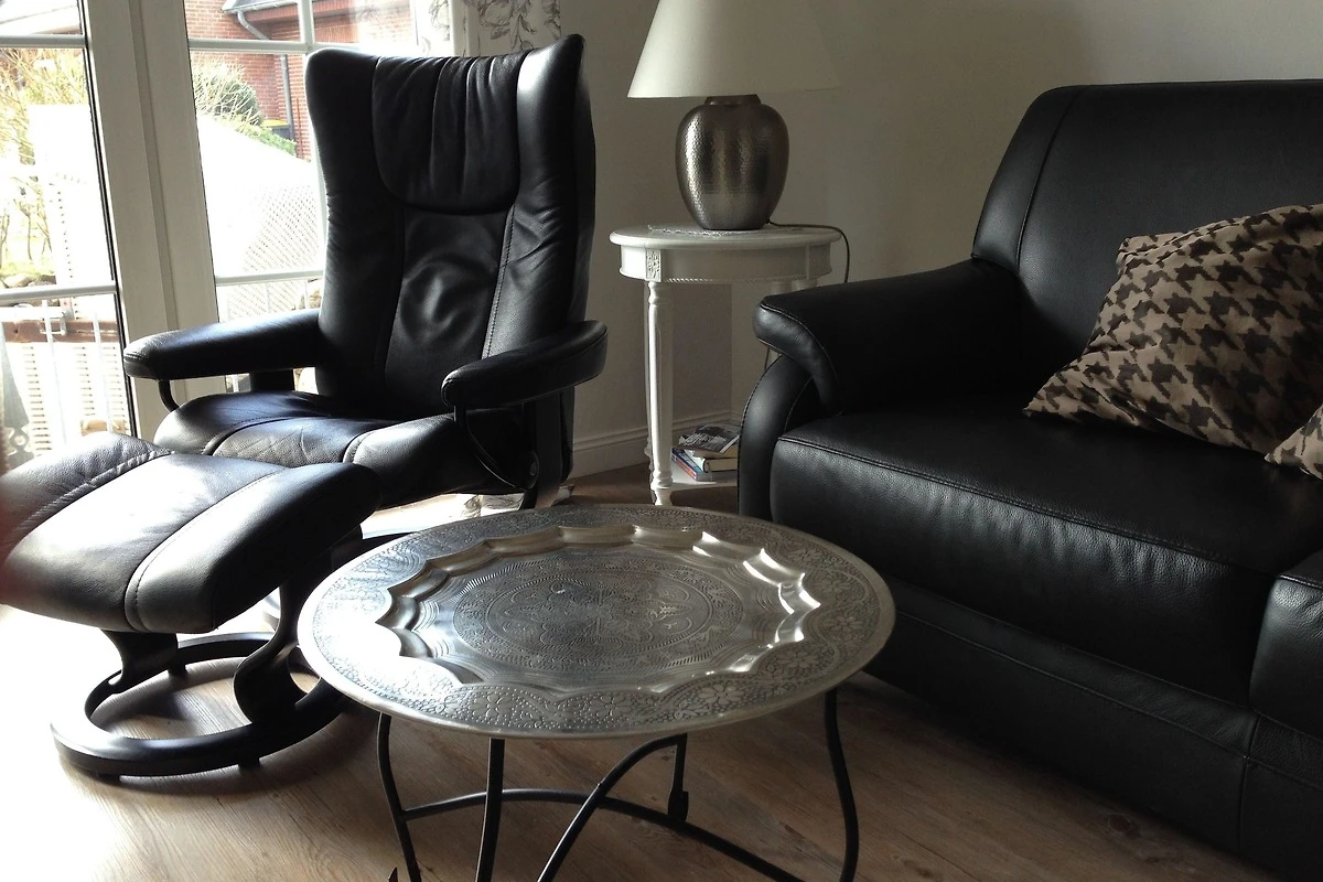 Im Wohnraum lässt es sich auf hochwertigem Ledersofa und STRESSLESS Sessel wunderbar relaxen; ein grosser toller LED Flat-TV und ein CD-Player mit IPOD Funktion sorgen für Unterhaltung.